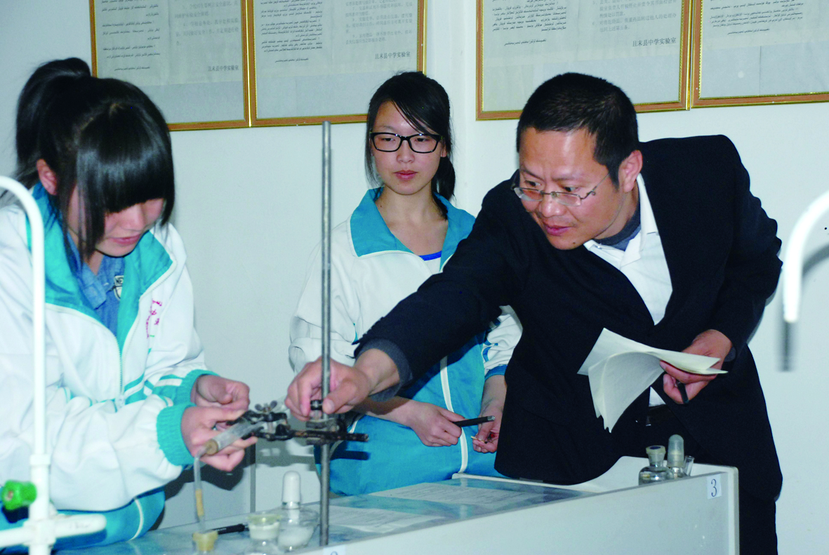 2014年4月,在且末县第二中学,周正国指导学生做实验