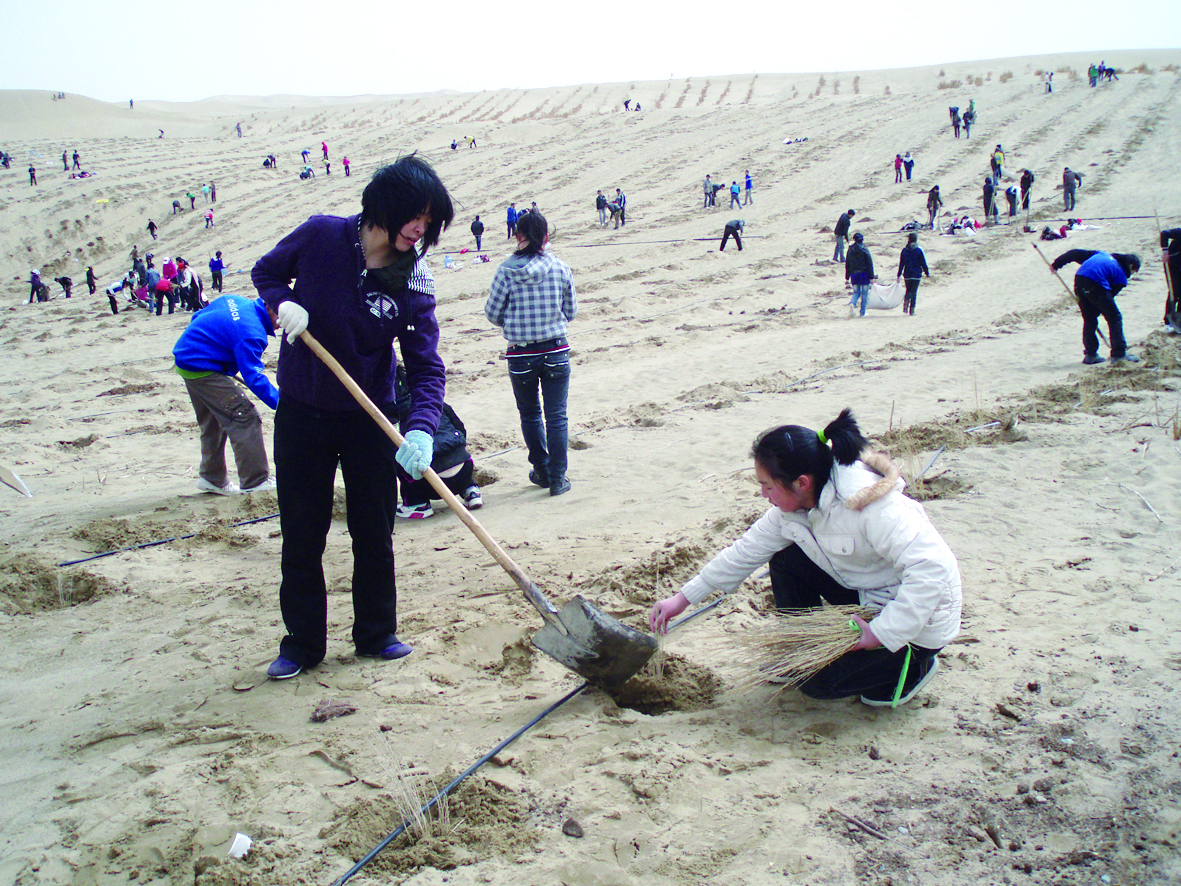 2011年4月,侯朝茹带学生到沙漠种树