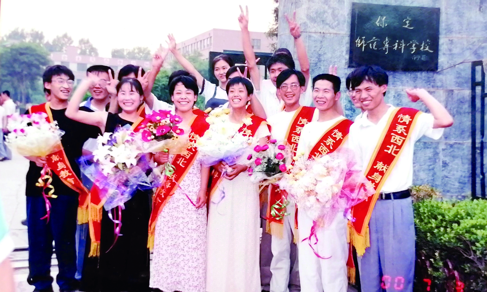 2000年,即将赴新疆任教的15名保定学院毕业生在母校(原保定师范专科学校)门前合影留念