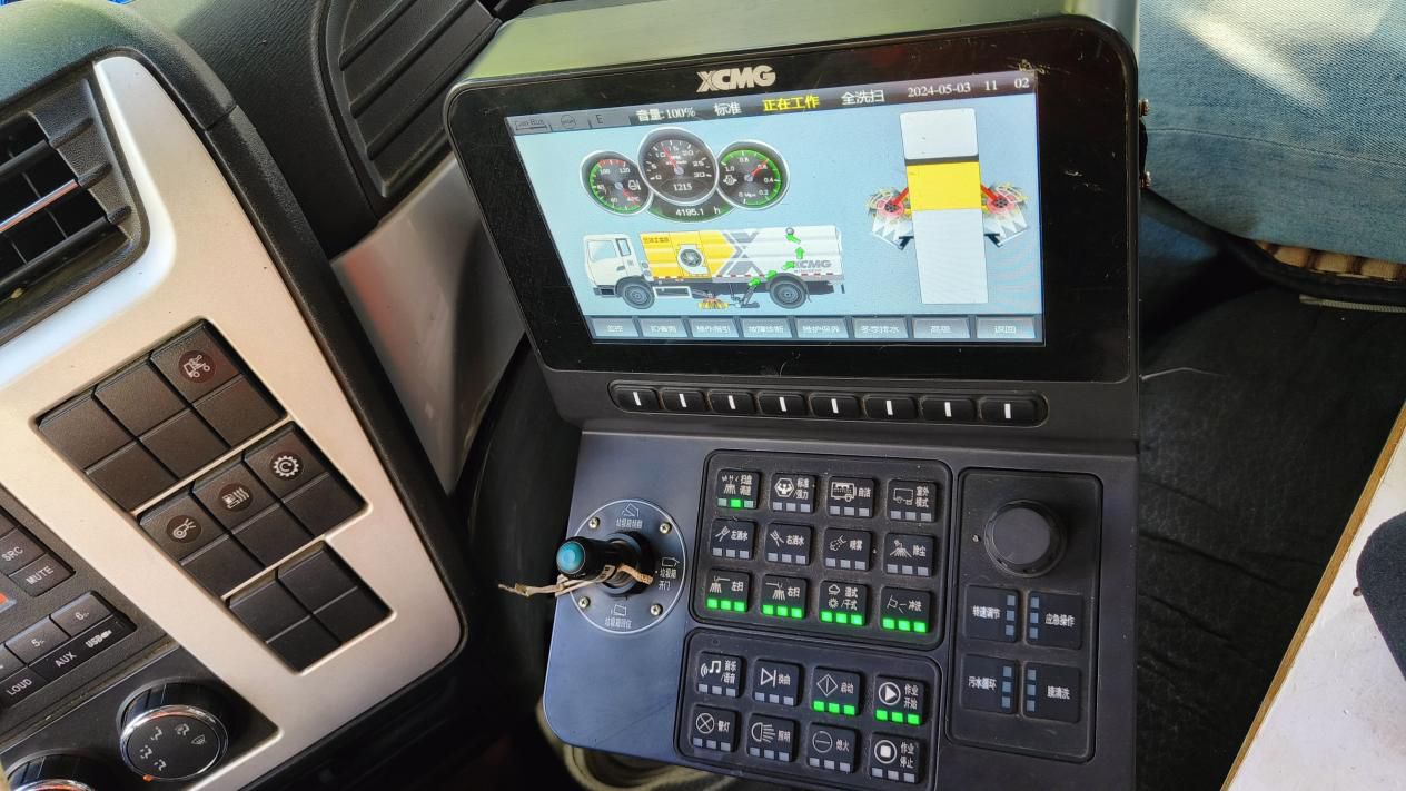检查好车况,记者跟随尹艳军上车准备开始上午的清扫作业。大号的方向盘、大号的变速器、大号的操纵机箱,除了空间是狭小的,洗扫车内所有的装置都比普通车大上一号。而车上最特别的就是在换挡杆的旁边有一个带显示屏的小型操作台,这就是副发动机的操作台,可以精准控制洗扫作业。