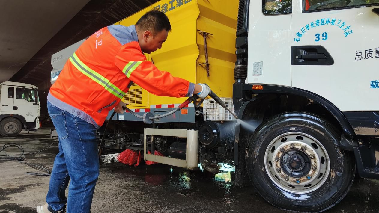 清扫过后“路见底色”,这是尹艳军对工作最基本的要求。中午1点,一个作业班结束,尹艳军的手心已经磨得有些泛红。而他放下车的第一件事就是拿起水枪开始清洗车辆。今年是他从事环卫行业的第16个年头了,他告诉记者,环卫工作代表着城市的市容形象,每一辆环卫车都要像他们作业过的路面一样,时刻保持干净整洁。
