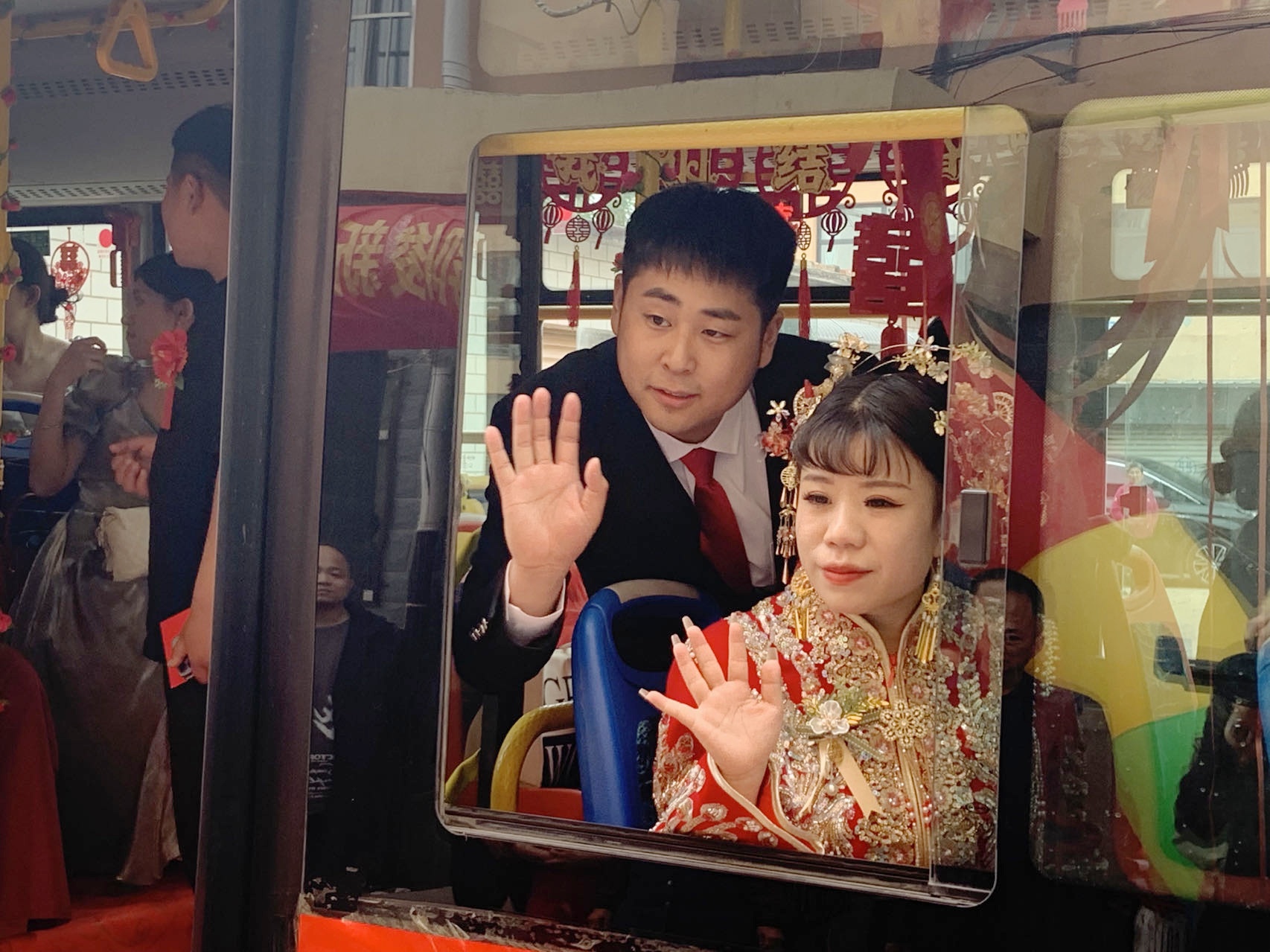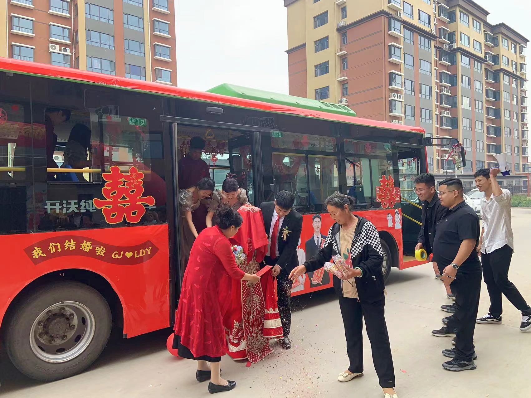 婚礼当天,两辆装饰一新的新能源公交婚车准时来到新郎家。新郎和接亲人员满怀喜悦的心情,上车去迎接美丽的新娘,车上欢声笑语,一派喜庆。返程路上,伴随着优美的音乐,一对新人和亲朋好友互致祝福,一路欢歌,大家乘坐爱情巴士,向着幸福出发。一帮00后的年轻人在公交婚车这个现代版的爱情巴士上秀足了恩爱,通过手机视频,把幸福时刻分享给更多的亲朋好友,也让勤俭节约办婚礼、移风易俗树新风的文明时尚传遍景州大地。