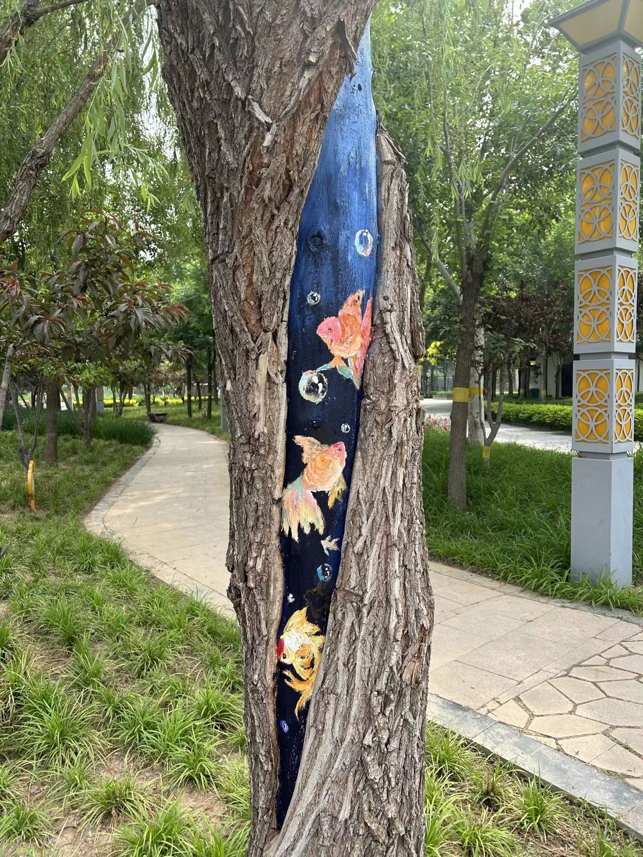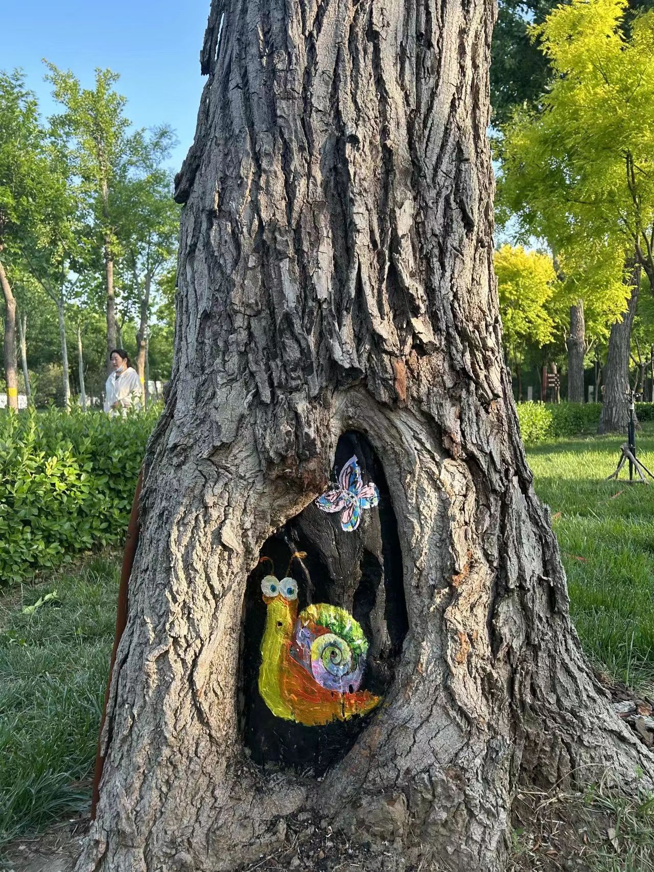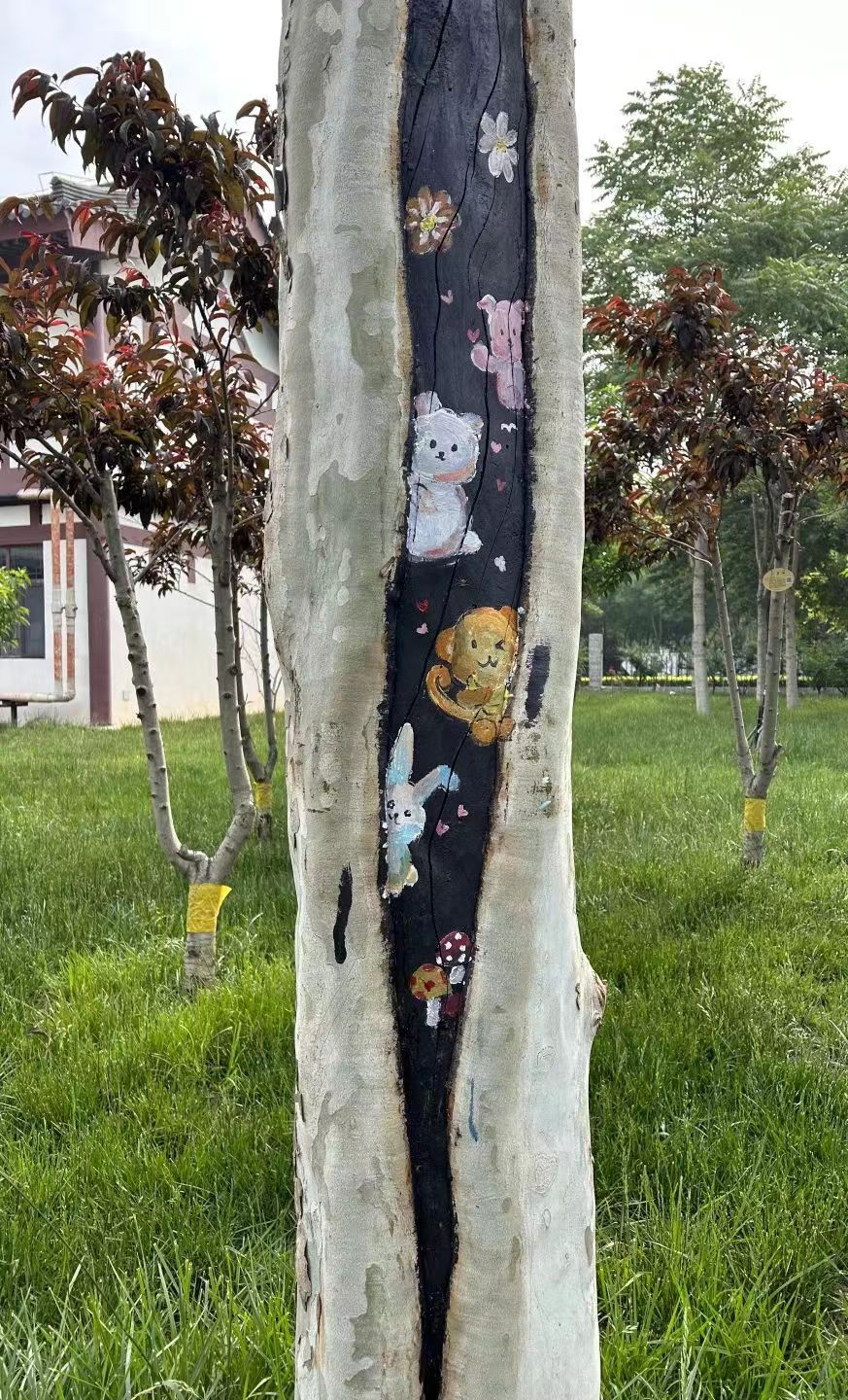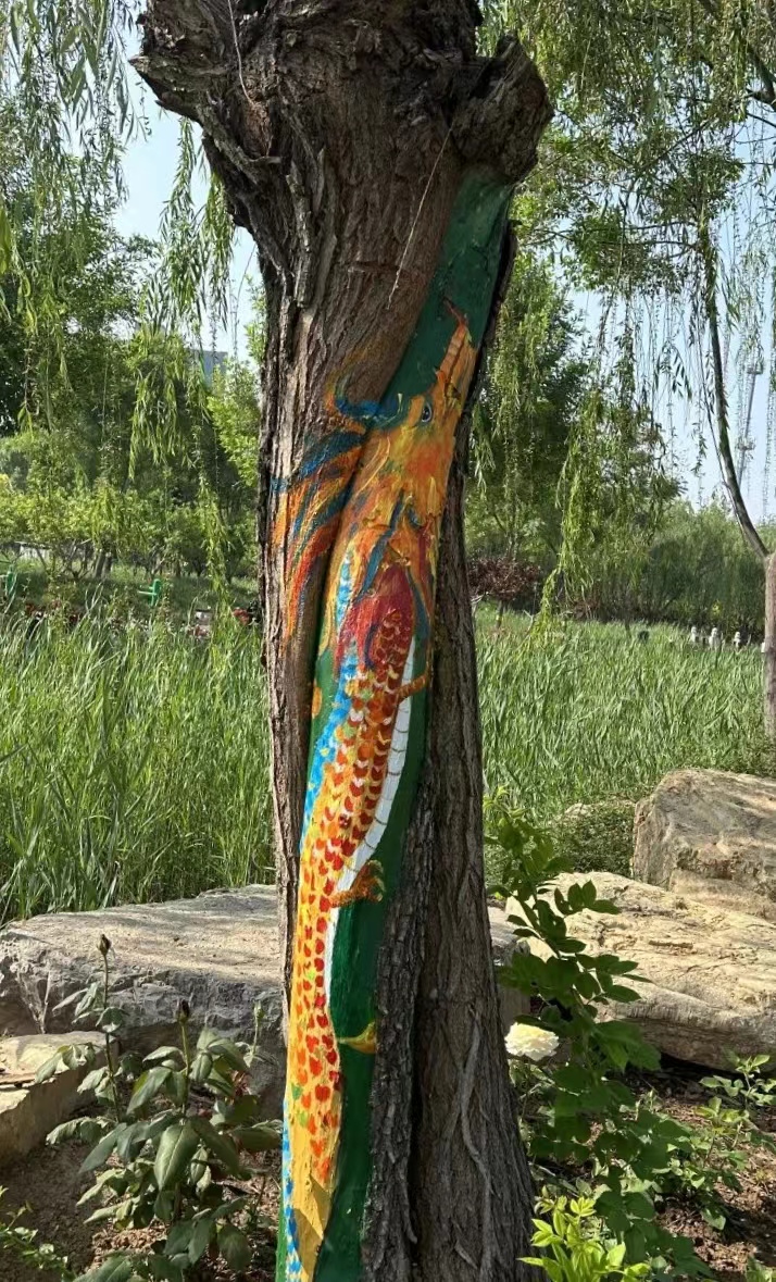“树木由于病虫害、长时间雨水侵蚀等原因,很容易形成树洞。树洞修复是树木养护的一项重要工作,传统修复方式是用水泥、石灰或其他材料把树洞堵上,导致树干上留下一块块难看的疤,非常不美观。”衡水市园林中心孔颖达文化公园负责人随妙如介绍,为了修补树洞疤痕,让树木更美观,他们萌发了彩绘的想法,为公园增添趣味性和艺术性。