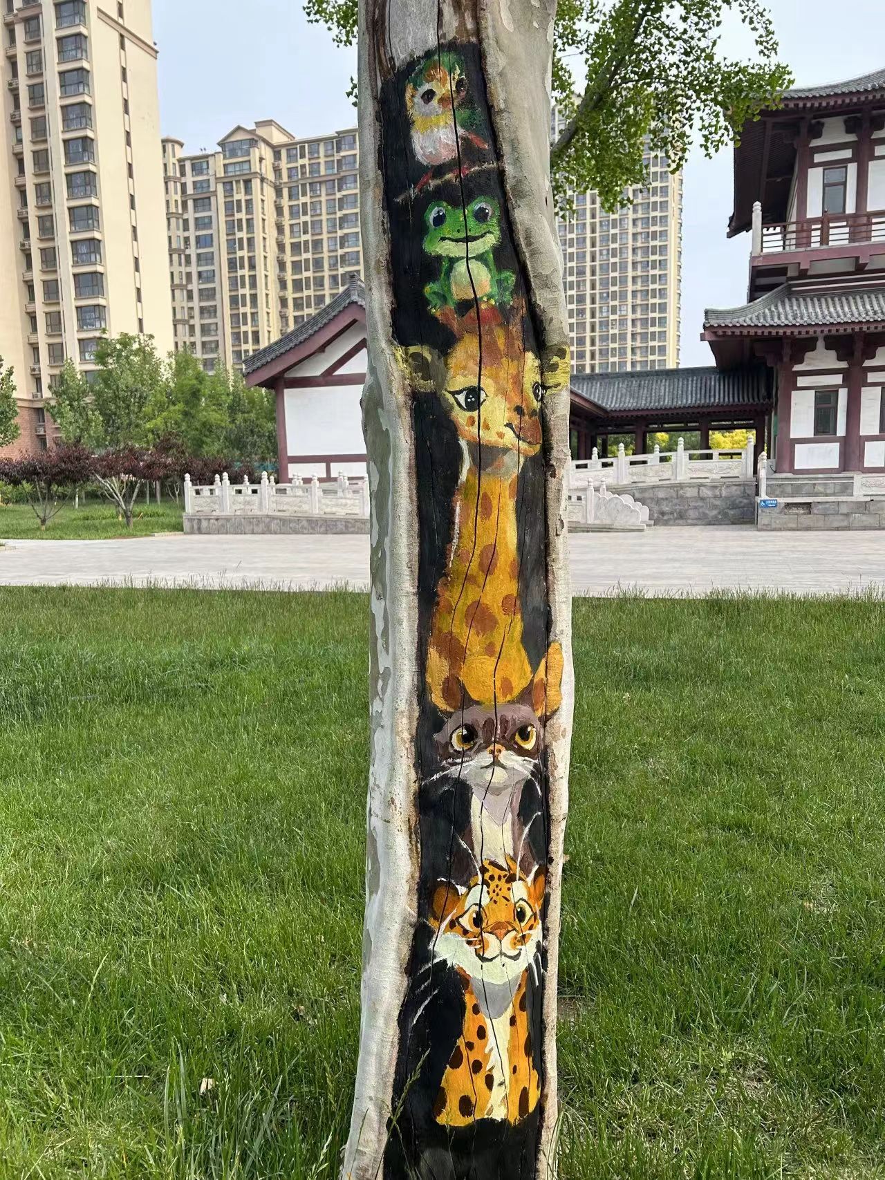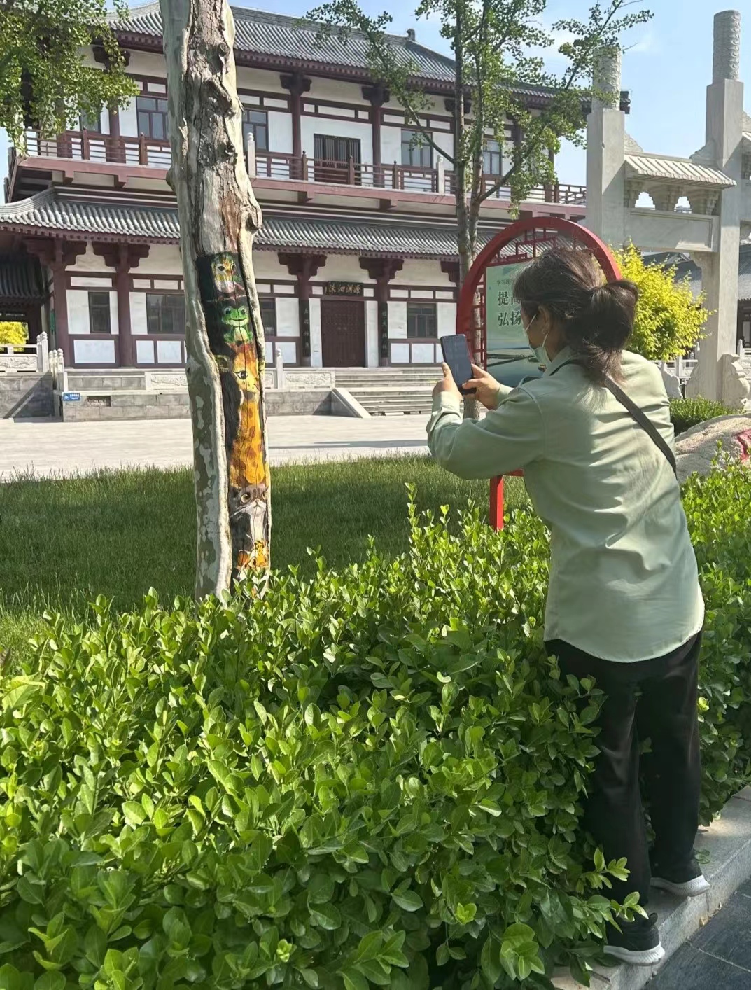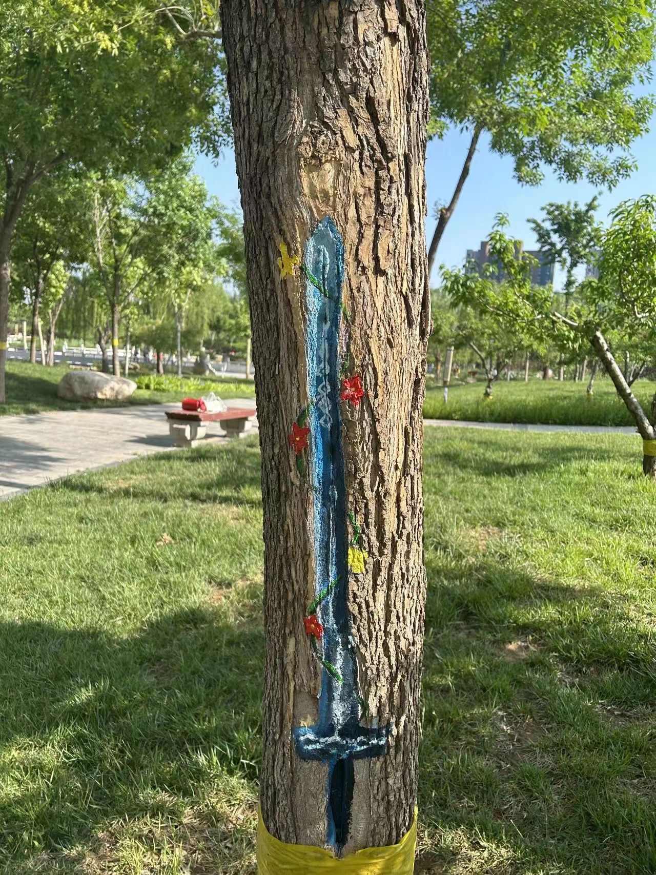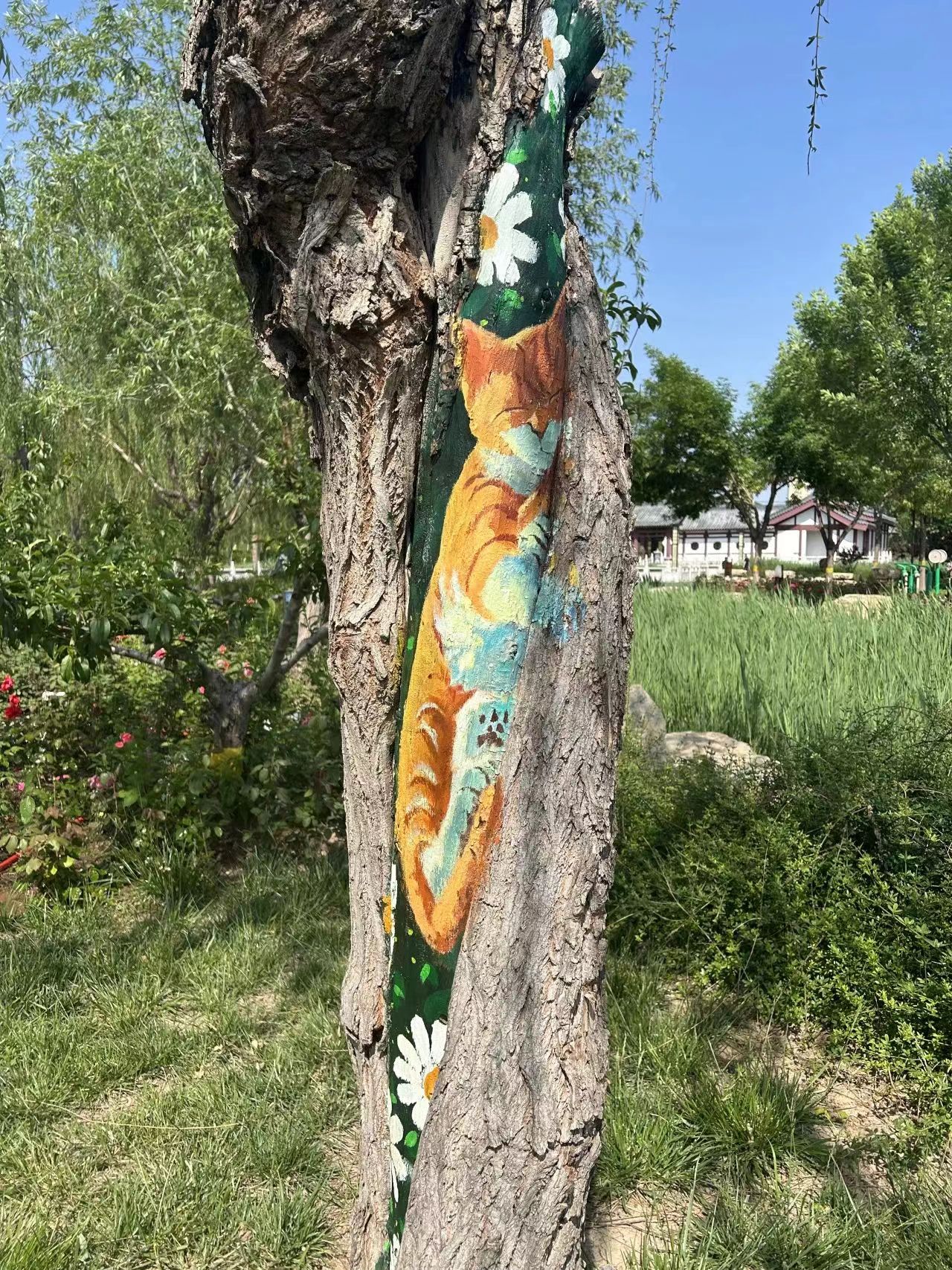 “树木由于病虫害、长时间雨水侵蚀等原因,很容易形成树洞。树洞修复是树木养护的一项重要工作,传统修复方式是用水泥、石灰或其他材料把树洞堵上,导致树干上留下一块块难看的疤,非常不美观。”衡水市园林中心孔颖达文化公园负责人随妙如介绍,为了修补树洞疤痕,让树木更美观,他们萌发了彩绘的想法,为公园增添趣味性和艺术性。