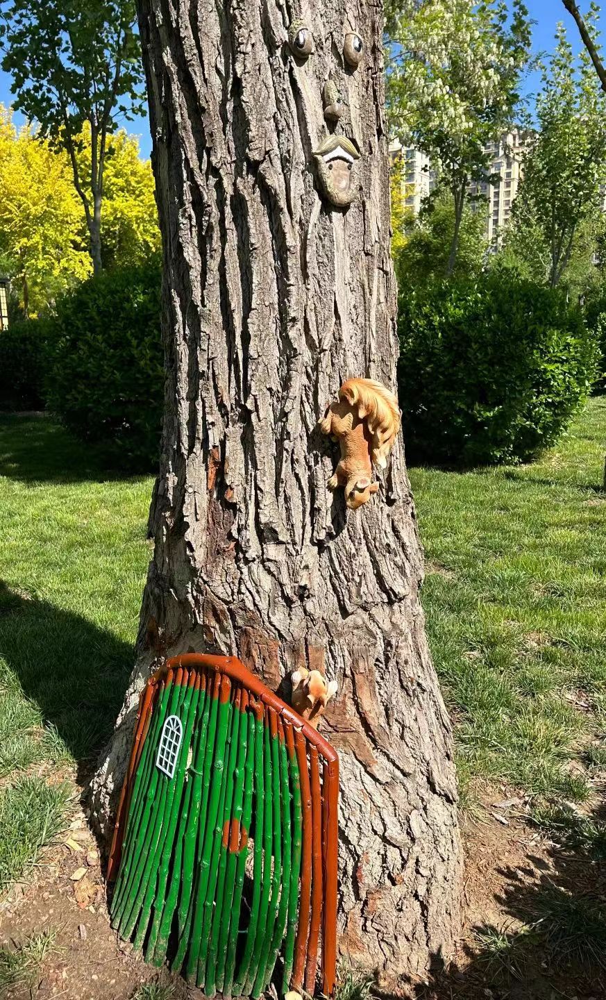 “我们在创作时根据树洞的大小和形状,选择不同的动物种类与造型,使之既有创意又能保持原来的形状和面貌。”随妙如介绍,对一些较深的树洞,他们利用树枝和铁丝手工制作成树洞门,刷上彩漆安装在树洞上,再在一旁点缀仿真小松鼠和可爱的小矮人,营造童话氛围。
