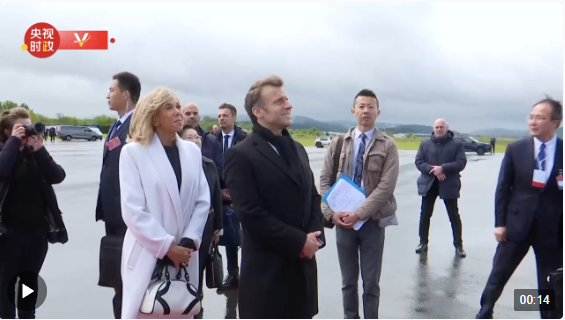 当地时间5月7日中午,国家主席习近平和夫人彭丽媛乘专机抵达塔布,马克龙总统和夫人布丽吉特及当地官员在机场迎接。