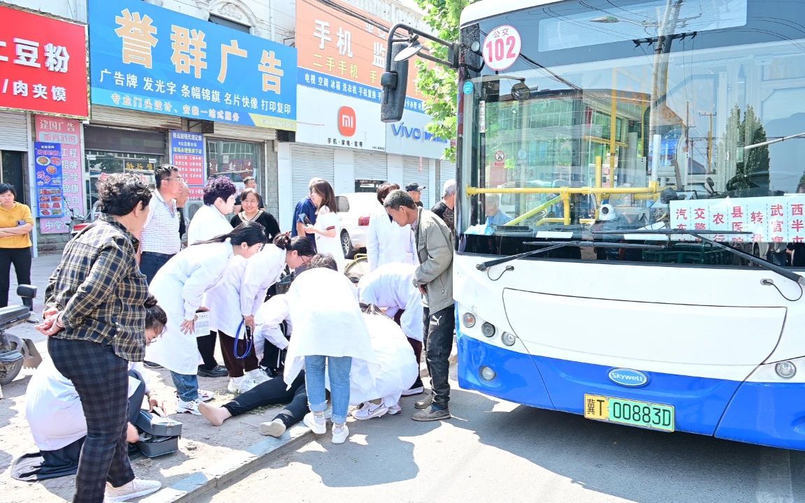 “快看,那里出车祸了,有位大娘摔倒了!”在义诊结束返回医院时,途经建国镇的街道,发生一起车祸,一位大娘被撞倒在地。院长居艳梅及其他医务人员闻讯立即前往事发地,对大娘进行就地抢救,为其听诊、测量血压和心率,积极给予对症处理,大娘意识逐步恢复。根据患者情况,医务人员建议尽快到医院进一步诊治。此时120救护车也赶到现场,大娘被及时安全送往医院,“真的太感谢了,多亏你们及时赶到!”大娘的家属感动不已,对医务人员连连致谢。