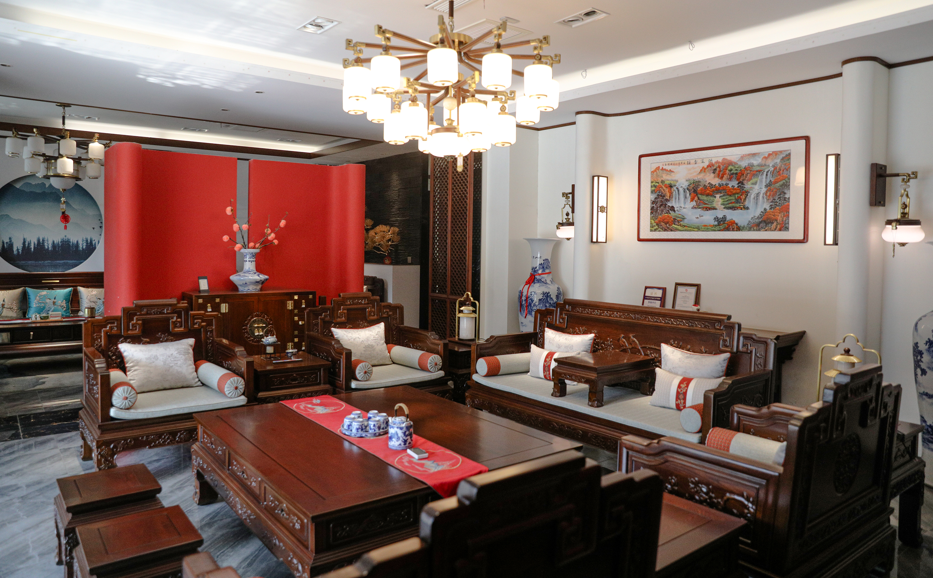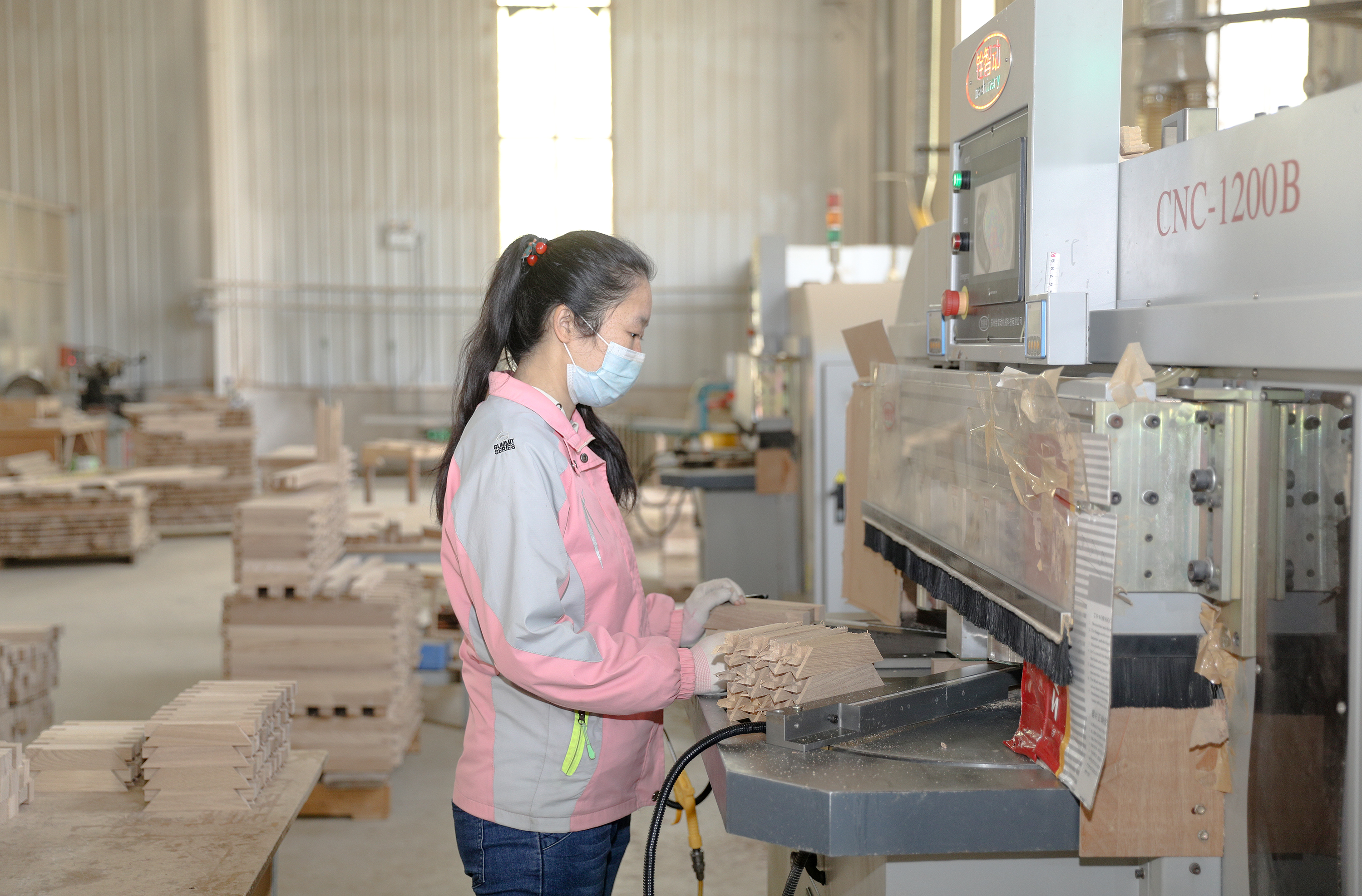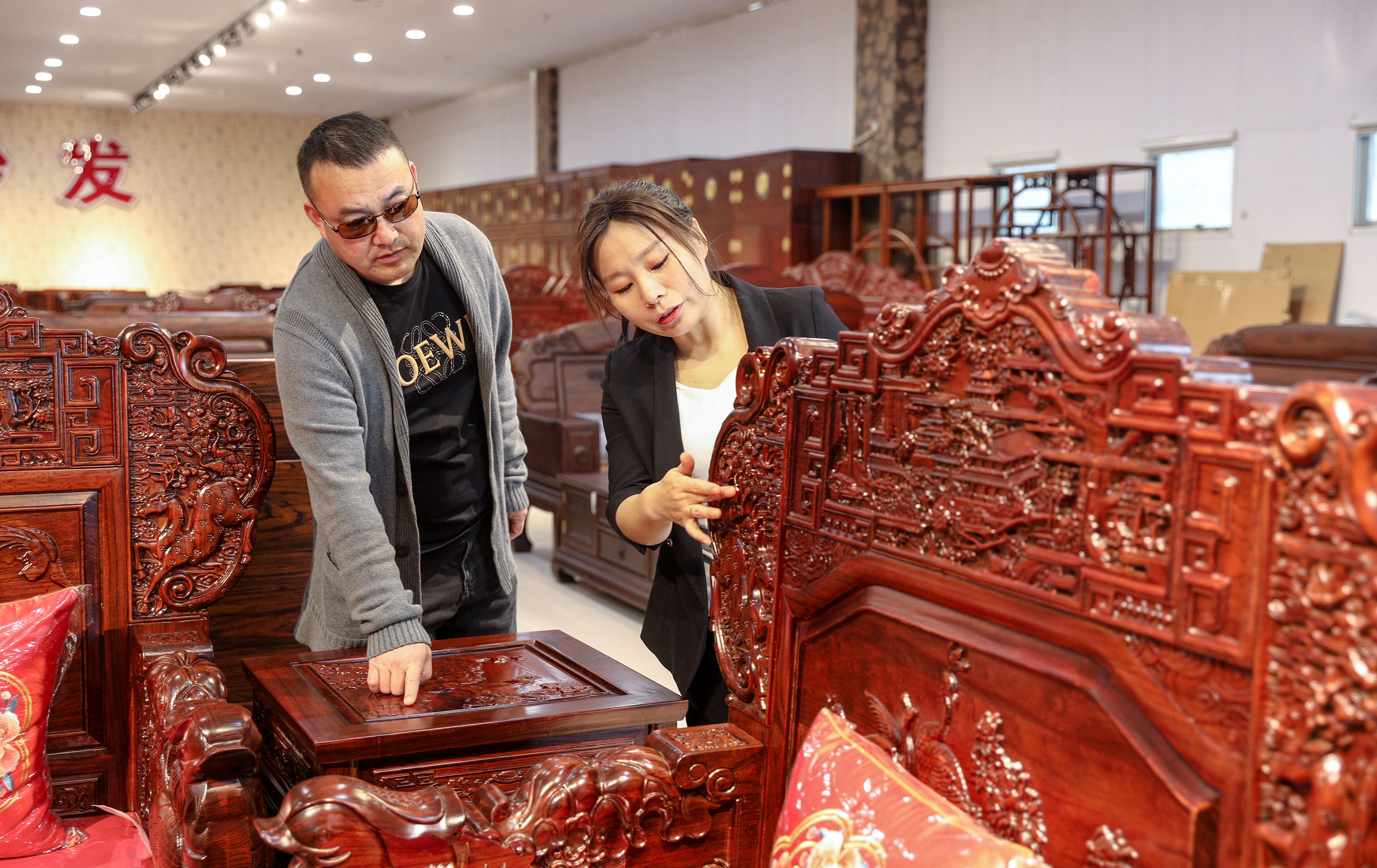 这家家具制造公司的前身是木器厂,主要生产和销售花台、花架、明清家具等,2018年初新增全屋定制生产线,在材质、工艺、设计上都进行了改革和创新,实现了产业升级。“我们以前主要生产老榆木古典家具,生产尺寸固定,雕刻图案以典故和吉祥图案为主,现在根据客户的需求定制尺寸,材质上选用红木、乌金木、黄云香等高端木材,雕刻图案也能融入现代元素,更符合现代人的审美和生活习惯,上海、深圳、南京的客户比较多,25%的产品还能出口到美国、日本、加拿大等国家。”品管部经理伍明凡说。