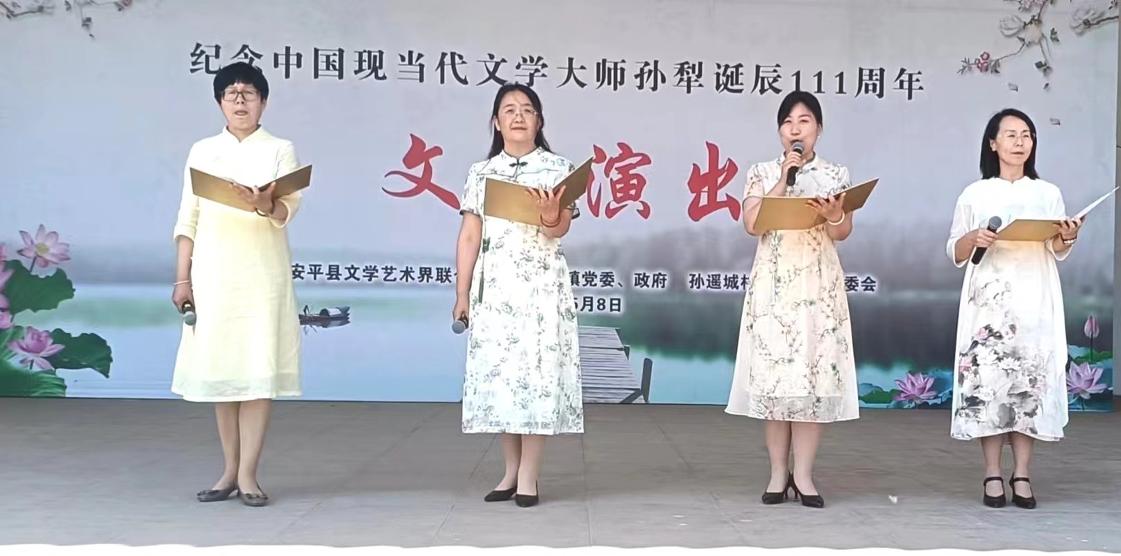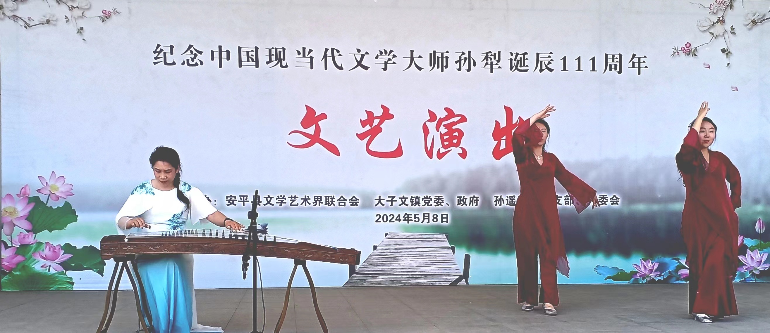 这次活动由安平县文联、大子文镇党委政府、孙遥城村“两委”联合主办,整场演出历时90分钟,安平县朗诵艺术学会、安平县音乐协会、安平县书画家协会、安平县作家协会、安平县第三小学明洋舞蹈队、超越琴行艺术培训学校、华羽舞翩培训学校、春之韵模特队、美在今朝模特队、县城社区代表队、大子文镇北王宋村代表队等近百名演职员联袂展艺,为纪念中国现当代文学大师孙犁先生诞辰111周年,奉上了一场文化艺术盛宴。