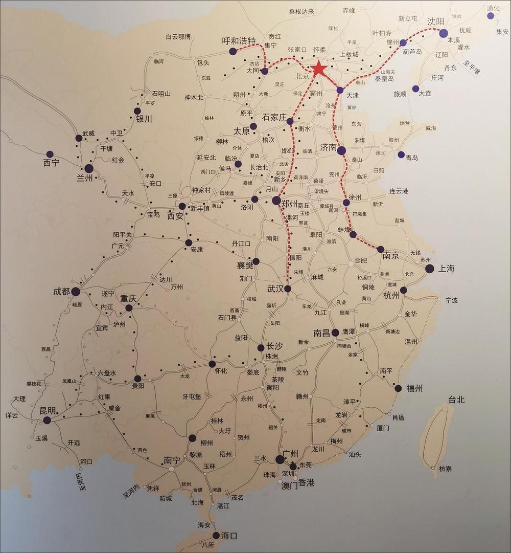 中国铁路源头博物馆内有一个巨大的沙盘,展示了唐胥铁路不断延伸的结果。“这是唐山火车站,我们可以看到以唐胥铁路为发端,铁路逐步延展。1888年修到天津,1894年修到山海关,1897年修到北京,1911年修到沈阳,最终延展为京奉铁路。历时30年,修建了贯通华北、东北的京奉铁路大动脉。京奉铁路竣工后,卢汉、津浦、京绥等干线铁路,分别以京津为起点,向华中、华东、西北等方向延伸,中国铁路网开始初具规模。”指点着沙盘,莫静涛解说道。