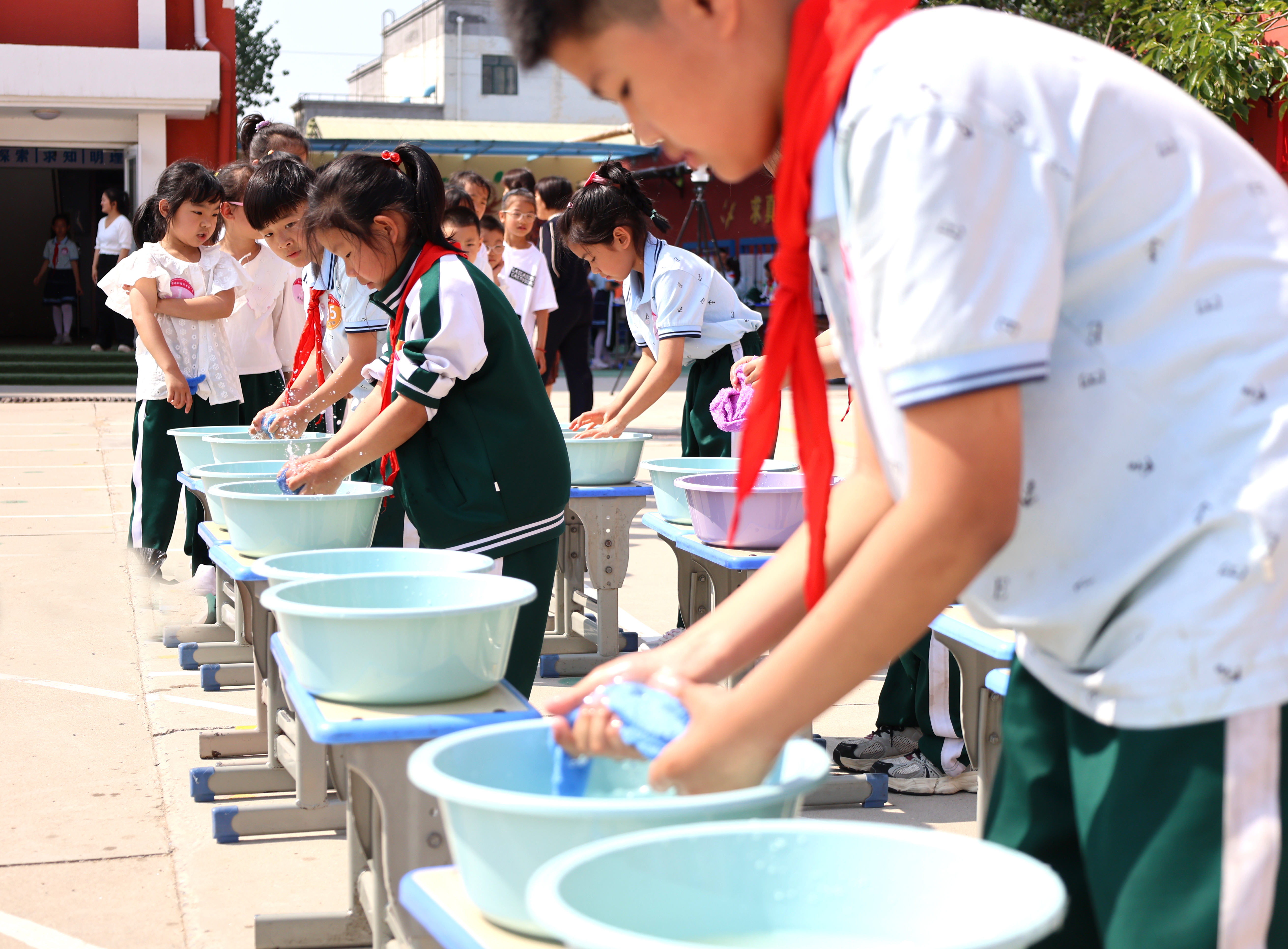 与此同时,学校还通过多种形式的劳动实践技能比赛,培养学生的动手与协作能力。操场西侧的洗毛巾、穿鞋带比赛进行得热火朝天,同学们的专注与活力让人印象深刻。还有那些用纸板、废纸、饮水机等废旧材料制成的房子、花盆等作品,以及同学们用轻黏土精心制作的荷花、动物、汉堡等作品,处处体现着孩子们的创意与环保意识。