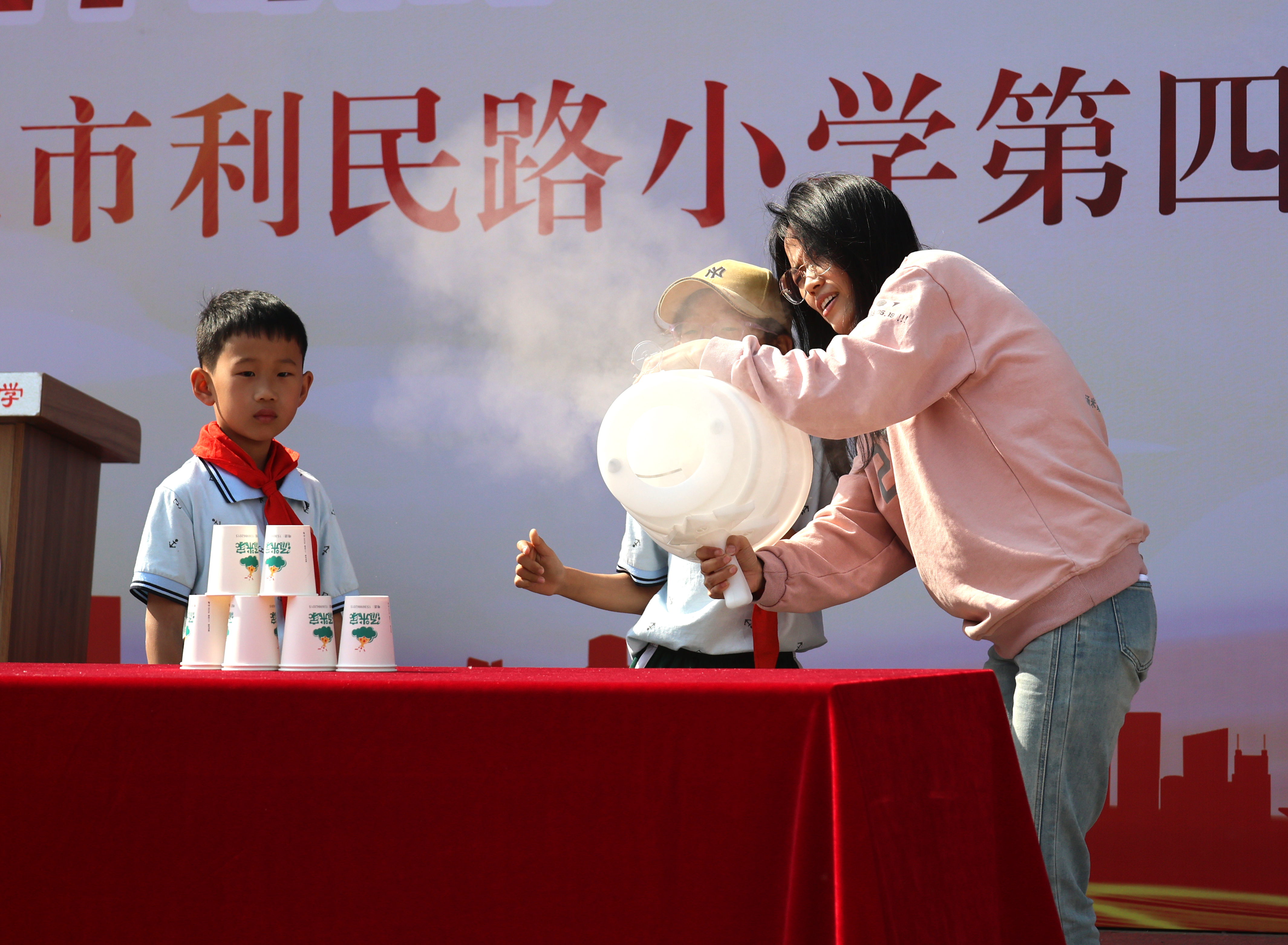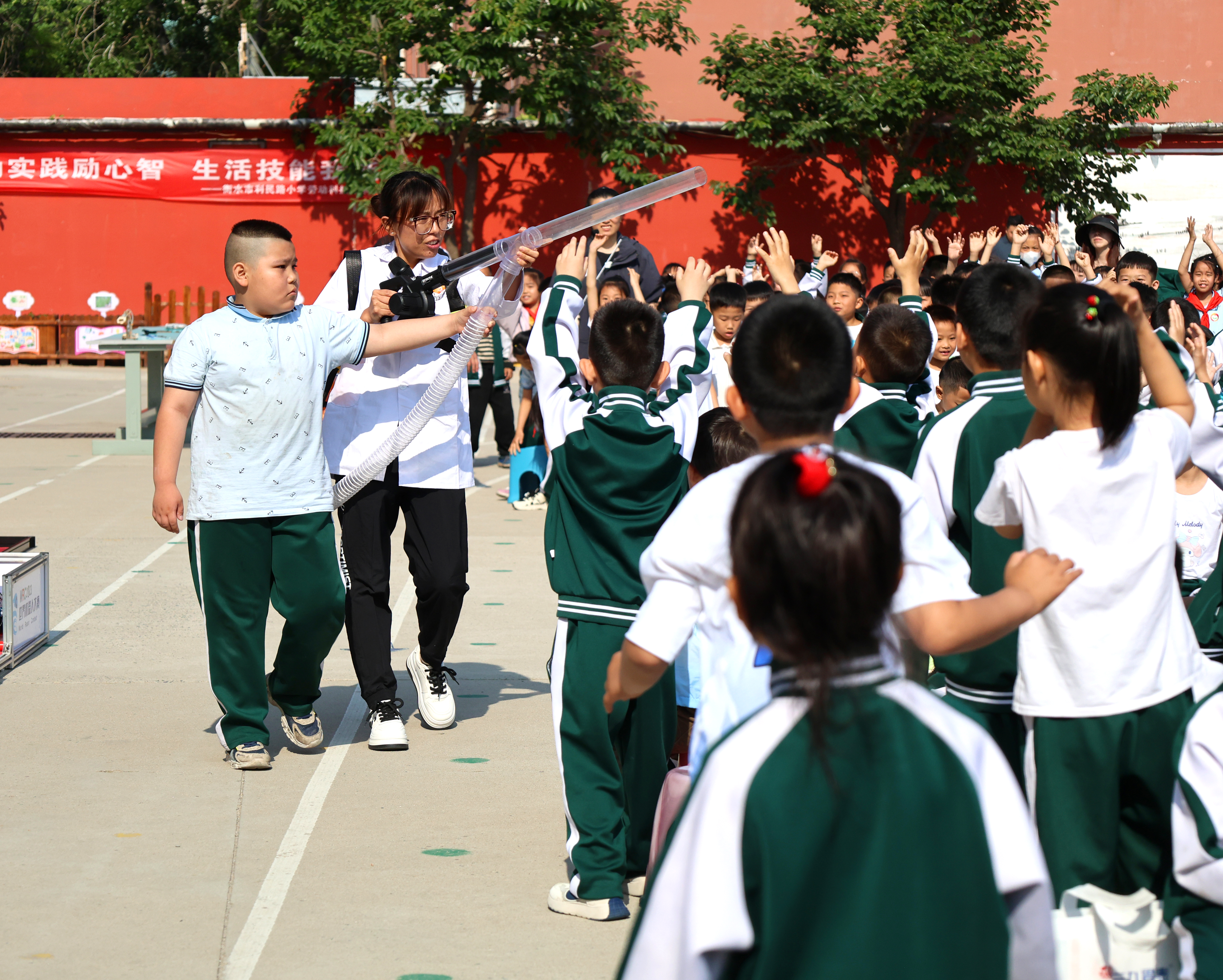 上午 8 时 10 分,一至四年级的孩子们欢快地齐聚操场,共同见证这场科技与艺术的交融。学校老师们精心准备的展示让孩子们大开眼界,超级空气炮的威力、水火箭的腾空飞跃以及大象牙膏的奇妙喷射,每一个科学现象都让同学们惊叹不已。