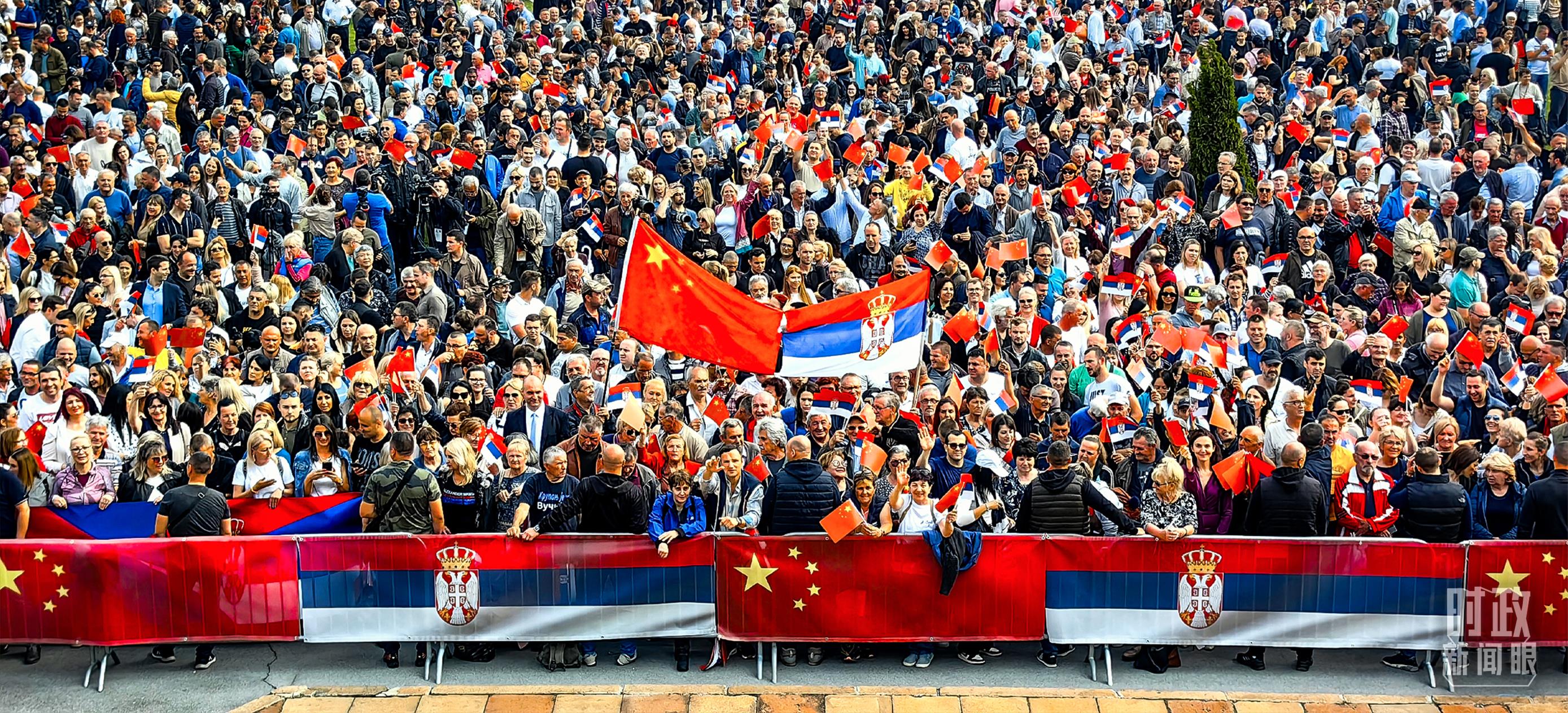 △一万五千名塞尔维亚民众齐聚塞尔维亚大厦广场,热烈欢迎习主席到访。(总台央视记者段德文拍摄)