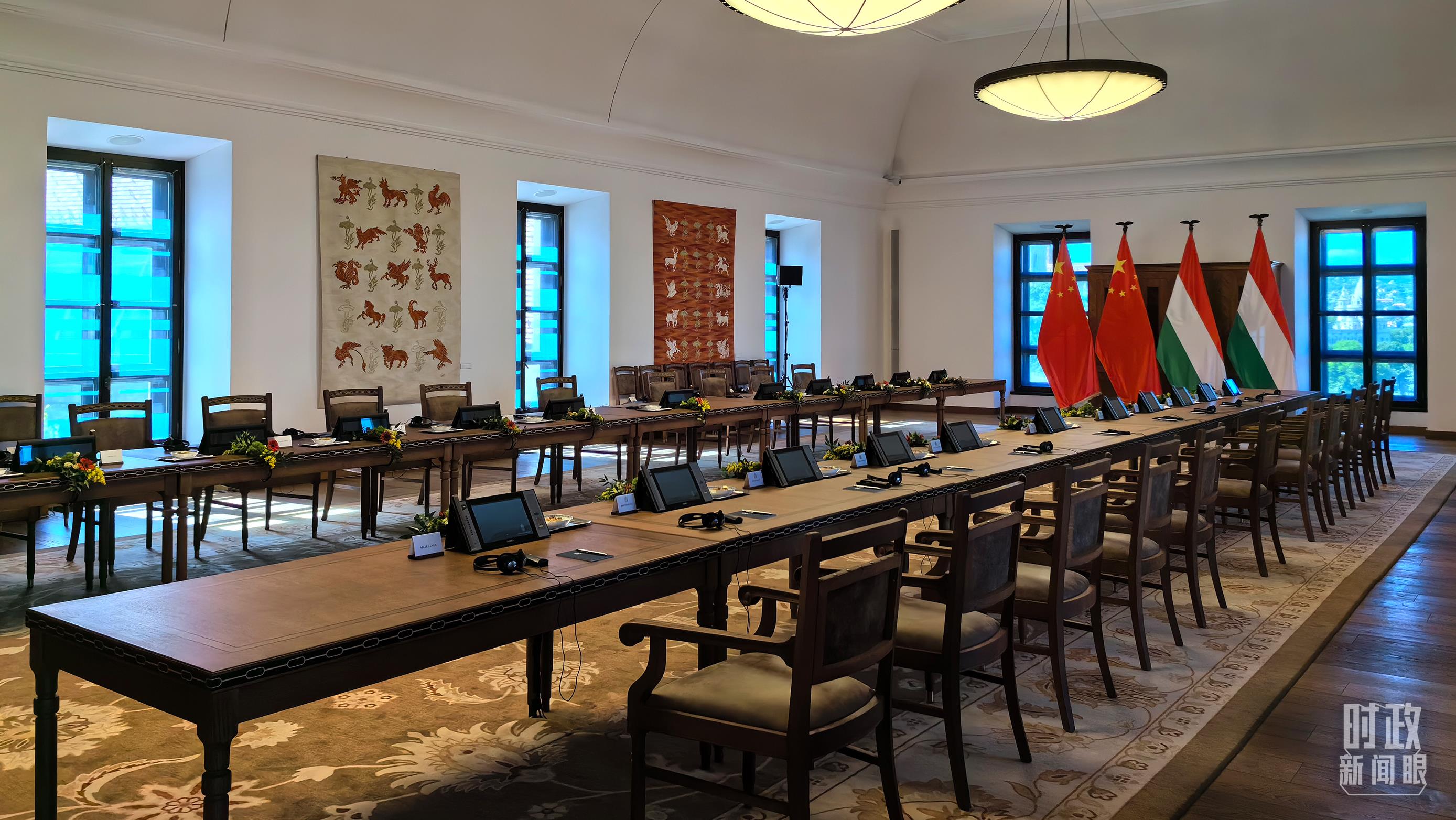 △5月9日,习主席同匈牙利总理欧尔班在这里举行会谈。这是会谈开始前的现场。(总台央视记者陆泓宇拍摄)