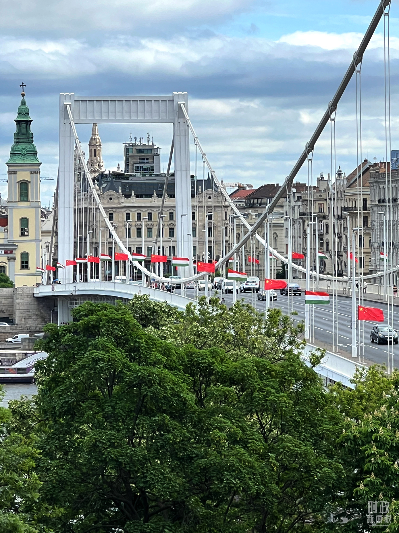 △悬挂中匈两国国旗的布达佩斯伊丽莎白大桥。(总台央视记者石伟明拍摄)
