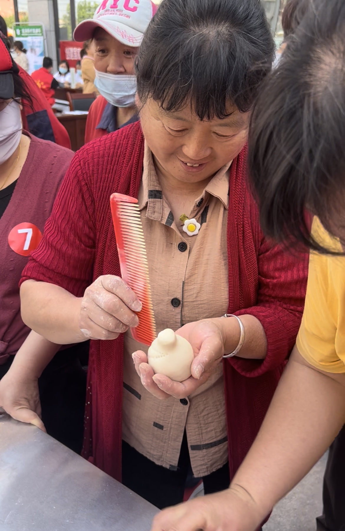 活动当天,花卉园社区户外的活动场地上,长桌上摆满了面盆、面粉、刀等各式工具,12名参赛选手纷纷就位,跃跃欲试。其中有年过六旬的退休老人,也有充满干劲的年轻小伙。14时,比赛正式开始,选手们各自展示身手,活面、醒面、捏形……一块块小小的面团在参赛者手中团揉几下,就变得光滑均匀。再用梳子、剪刀在上面划几下,一个个寿桃就出现了,形态美观,不少围观者赞不绝口。“我平时做面食比较多,我蒸的馒头家里人都说好吃。听说这次搞了个蒸馒头大赛,我就立刻报名了。”居民陈女士说。已经退休的王大爷边揉面边告诉记者,“现在人们生活节奏快,好多人都不亲手蒸馒头了,但是这项传统手艺不应该被人们遗忘,自己亲手蒸的馒头才最香。”王大爷说,能参加这个活动特别激动,要好好展示,蒸出一锅香喷喷的馒头。