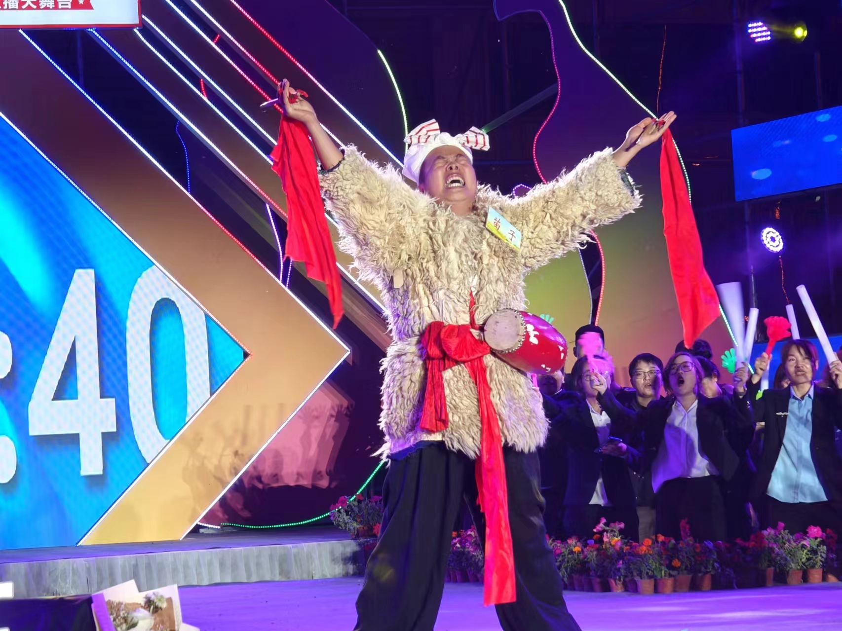 最后出场的是位叫苗子的陕北汉子,他带来的安塞腰鼓表演,随着欢快的表演,把人带入其中,他的腰肢随着鼓点的节奏扭动,仿佛整个人都融入了音乐之中。