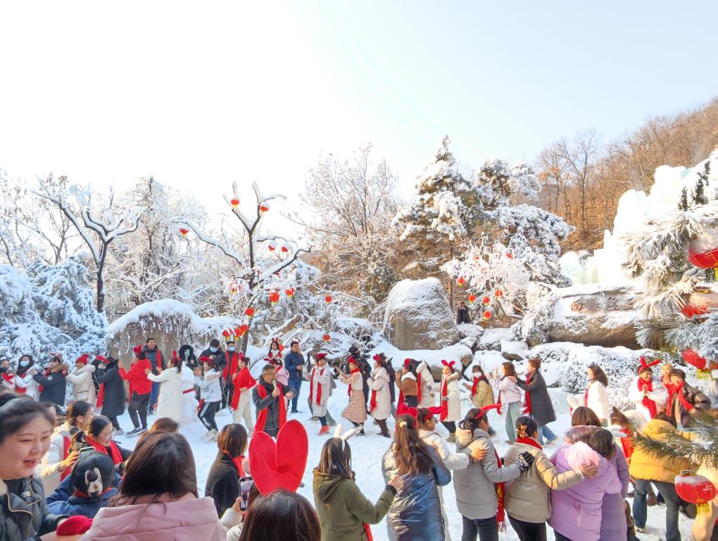 1月13日,在京津冀三地交界处盘山风景名胜区举办的首届京津冀盘山冰雪文化节上,游客在欢乐起舞。新华社发