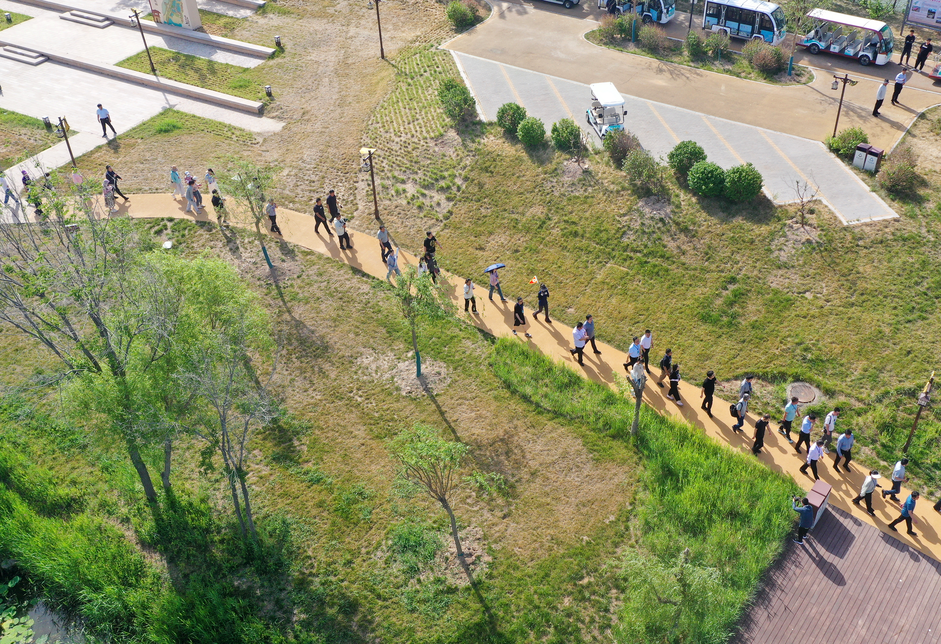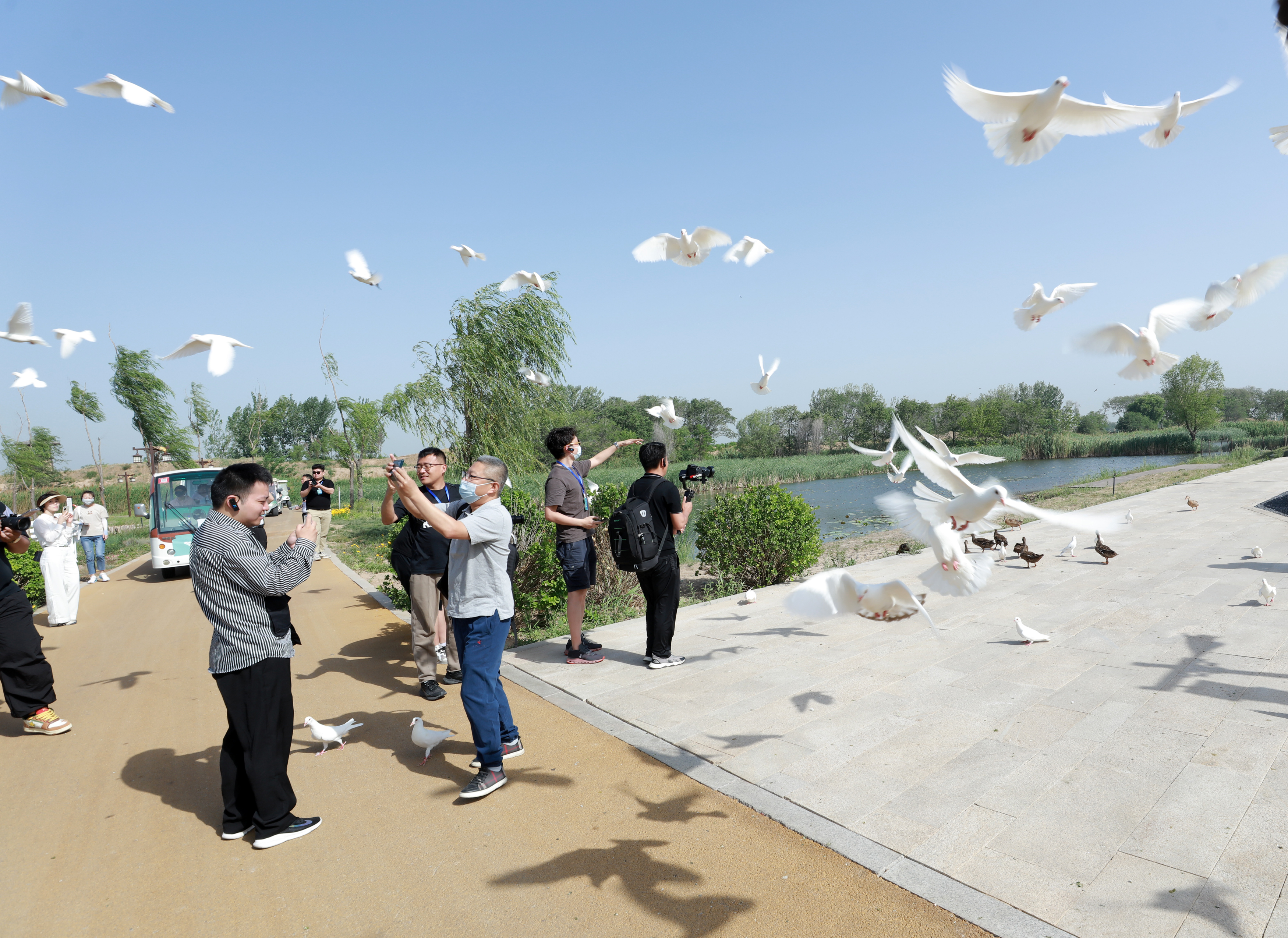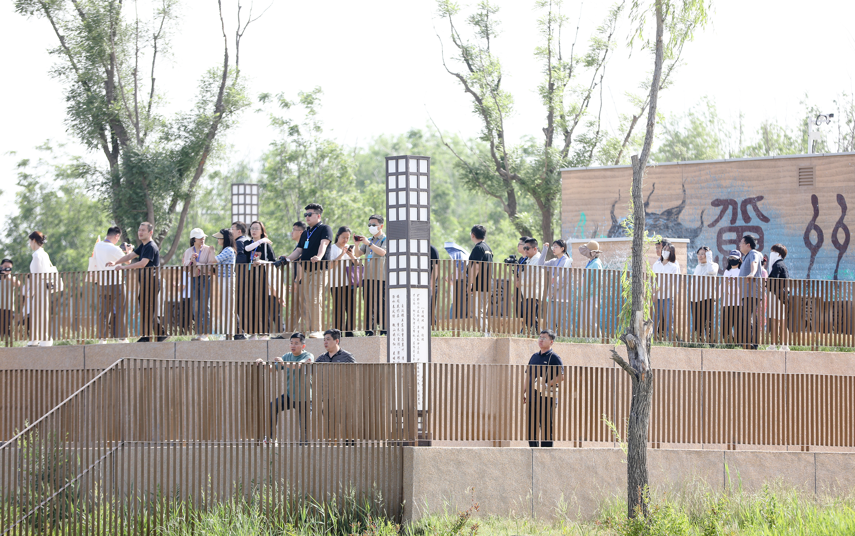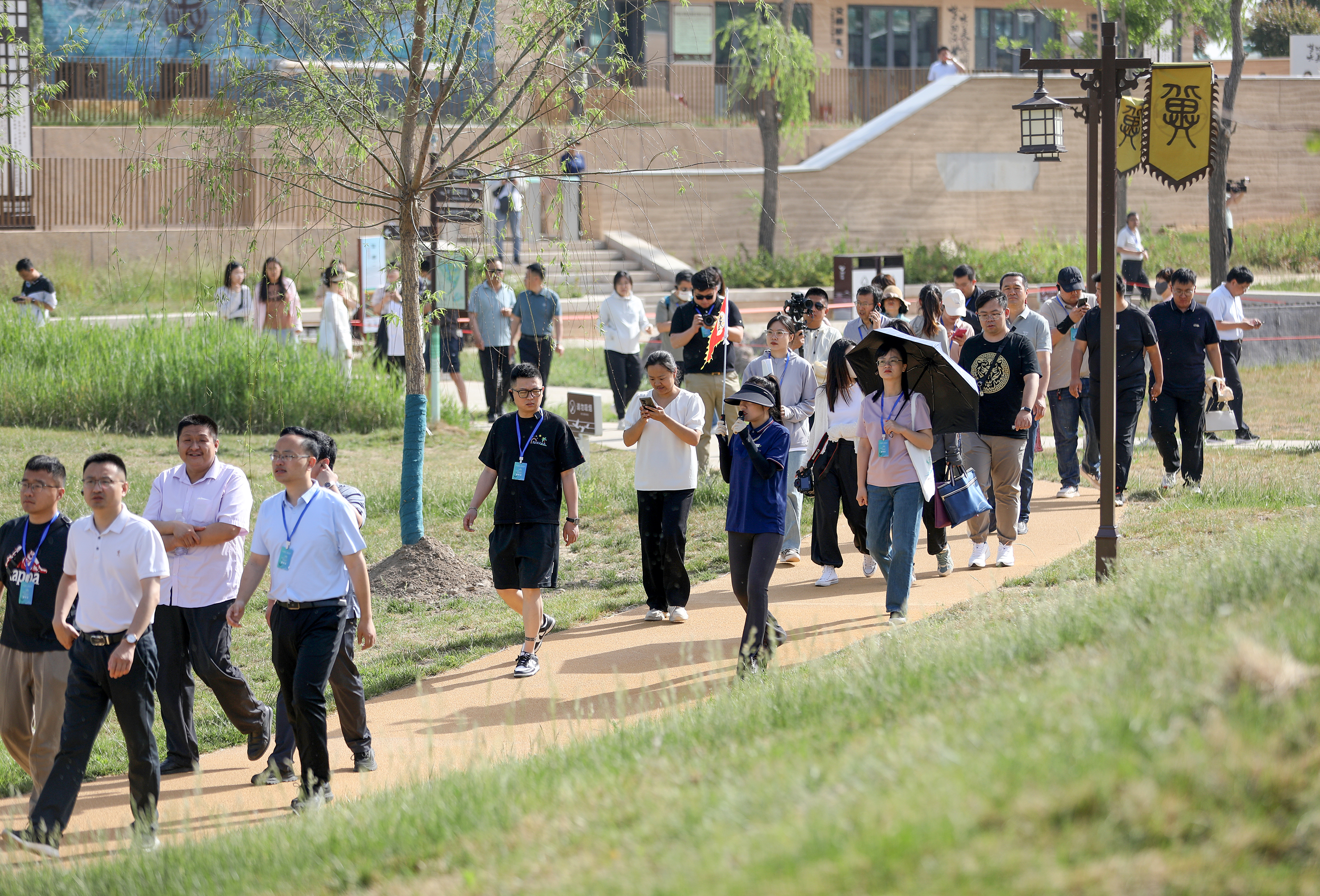 沿着古城遗址展区的小道一路前行,古城墙蜿蜒矗立,透过它仿佛能望见历史的烽烟穿越时空缓缓走来,给人以沧桑之感。向前行,生态区、研学区、考古区等节点众多。在这里,主题采风团的一众媒体人既体验了鸟儿高飞的生态美,也实景观摩了古人夯筑城墙的全过程,趣味感十足。