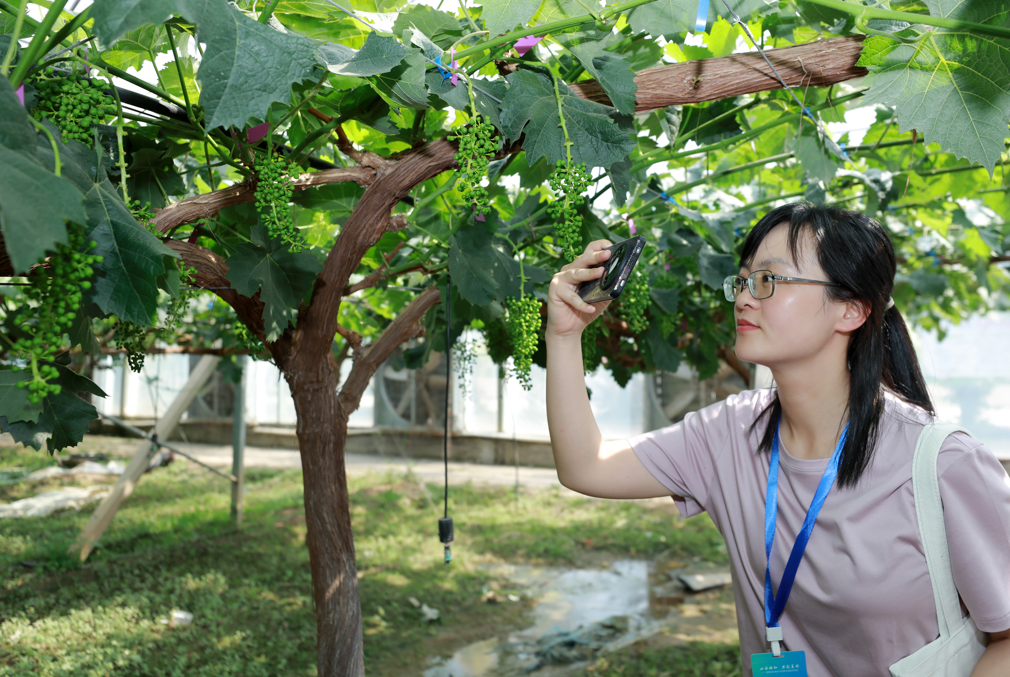 高标准日光温室内,一行行葡萄藤架整齐排开,一串串翠绿的葡萄幼果挂满枝头。葡萄架下,随处可见温度传感器、滴灌设备以及智能化卷膜系统等科技设备,管理员通过手机APP便可对整个种植基地的智能科技设备进行调节,随时随地掌握葡萄生长情况,确保果实的甜度和口感。