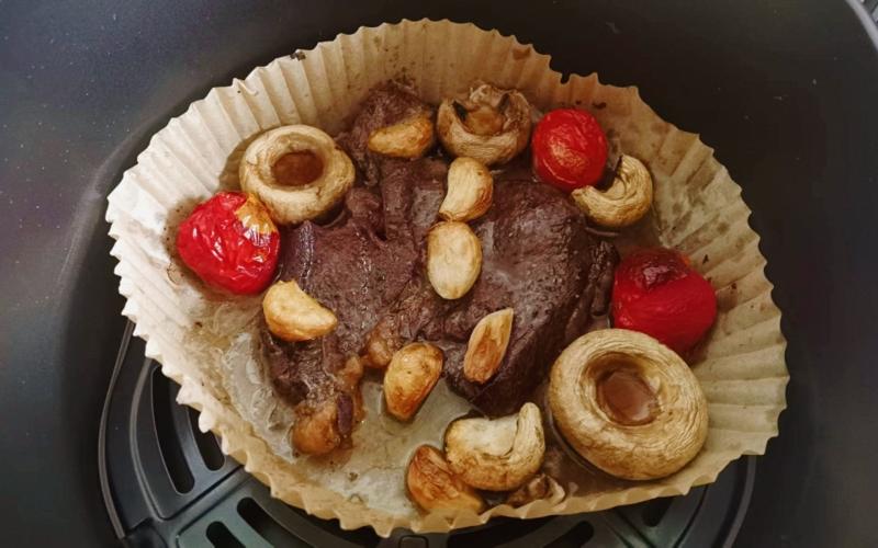 4. 把牛排、口蘑、大蒜放入空气炸锅,200℃烤5分钟。
