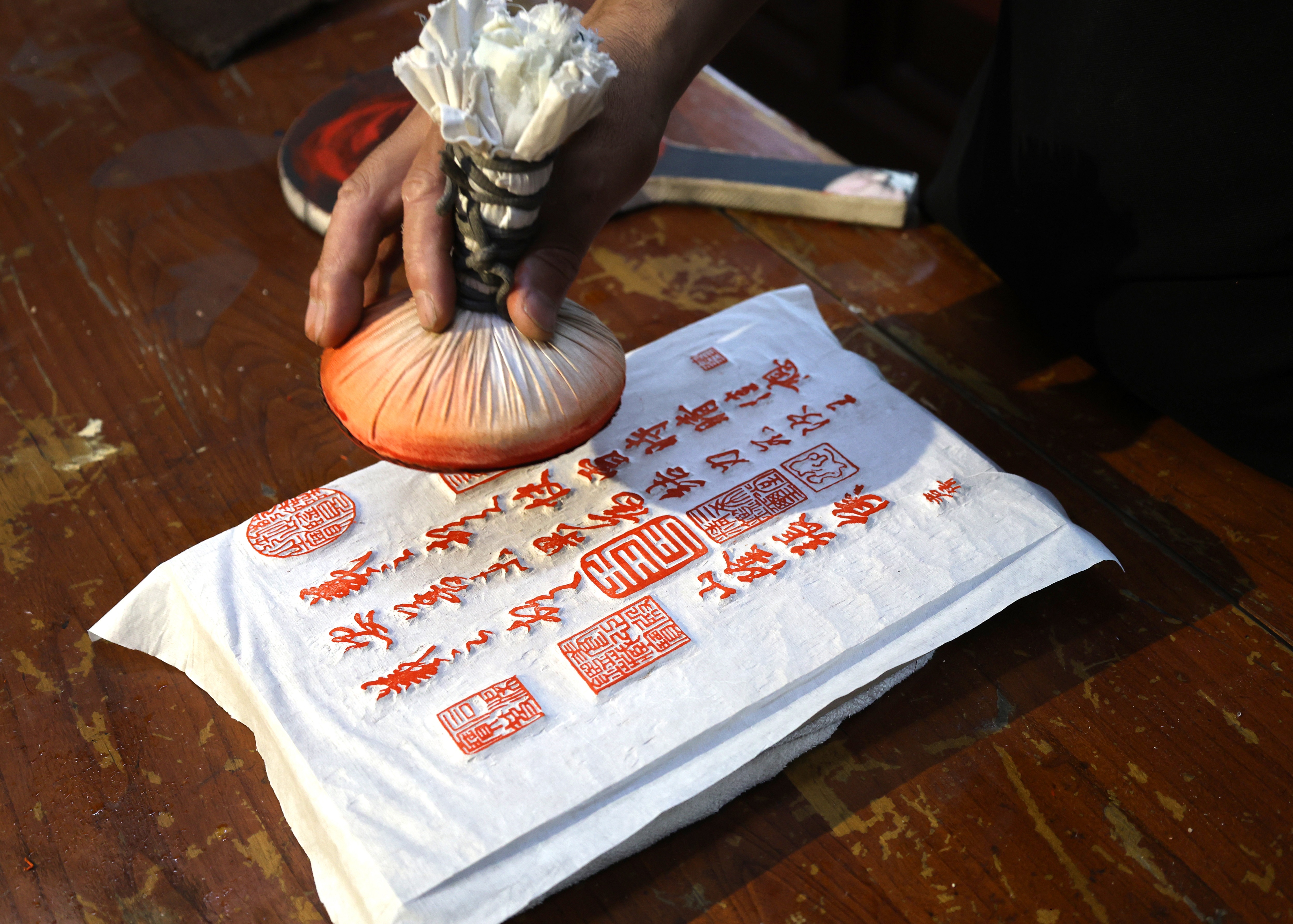 随后,在李新朋的介绍下,记者了解到更多关于法帖的精彩内容。衡水法帖的传承区域主要集中在以衡水市桃城区郑家河沿镇阎庄为中心的周围 70 多个村庄,且阎庄规模最大、最具代表性,故而“衡水法帖”也被称为“阎庄法帖”,阎庄更有“中国木刻法帖第一村”之誉。明朝永乐年间该区域战事水患频发,民不聊生,人们为避战乱奔走他乡,多以贩卖笔墨糊口。阎庄一位阎姓老汉酷爱书法艺术,在贩卖过程中遇碑便拓、见帖就求,为拓展生意萌生了刻版拓帖的想法,自此开始制版售帖且久盛不衰,技艺也在当地代代相传。至清中期,阎庄法帖刻拓已形成完整产业链条。清末民初,阎庄法帖进入北京,据记载,衡水阎庄人阎世竹和阎秉彝师徒在北京琉璃厂设有店铺,分别是清光绪二十年开设的“怡墨堂”和民国十六年开设的“蕴竹斋”。因清末维新思想传播,推动了阎庄法帖扩大生产经营规模,除京津冀外,还远销山西、陕西、内蒙、辽宁等地。