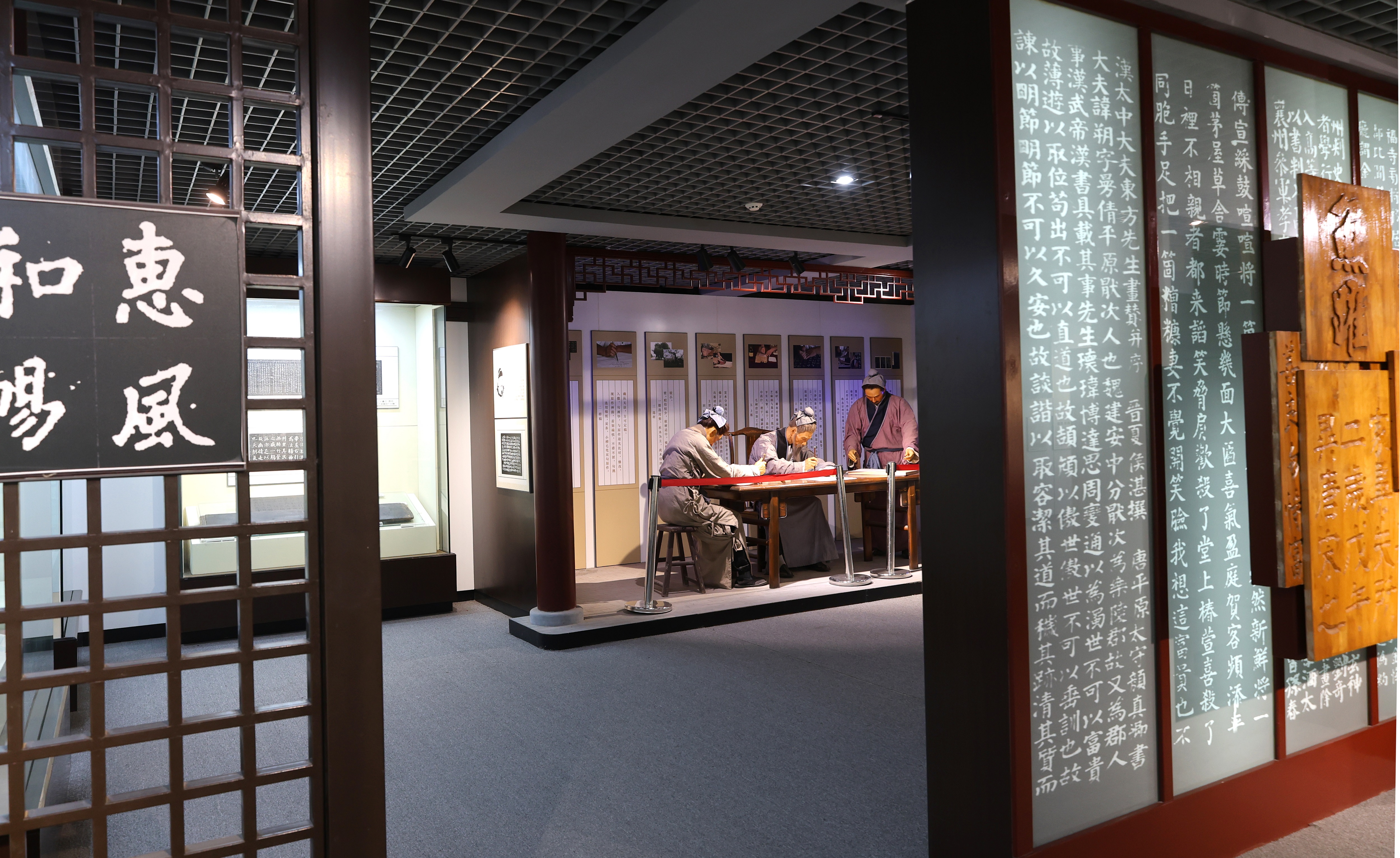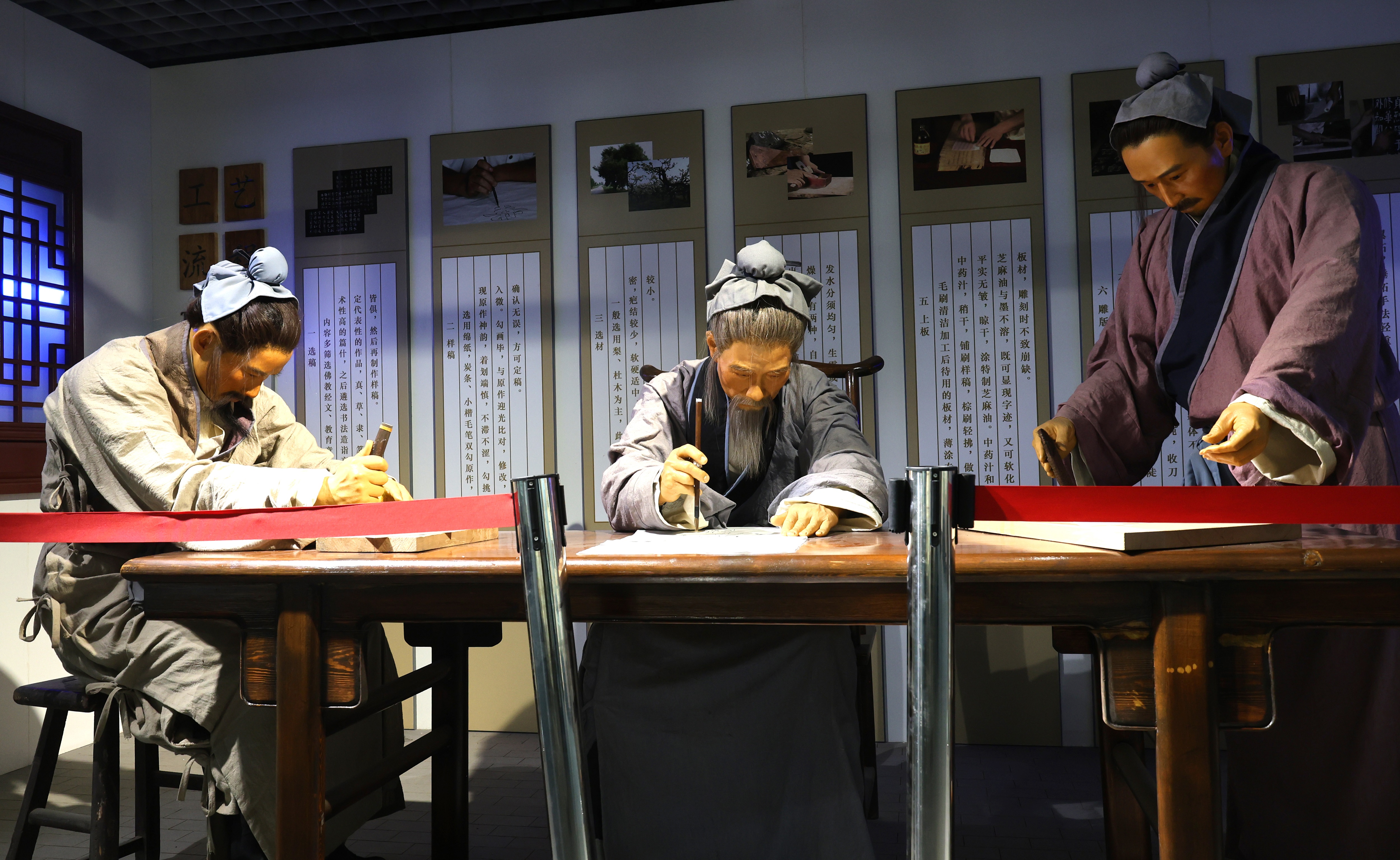 馆内设有一组展示法帖制作场景的蜡像模型,只见三名古代男子围坐在桌前,其中一人正绘制样稿,一人一手紧握刻刀、一手拿着选好的木材正要下刀雕刻,另一人则站在桌旁,一手拿着毛刷正进行上板操作。