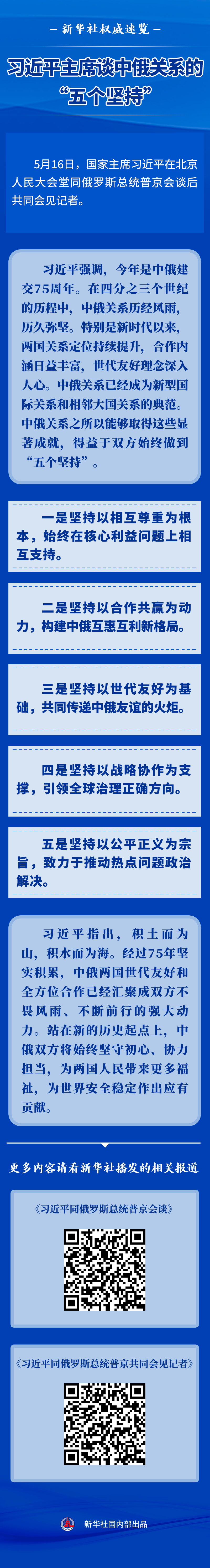 5月16日,国家主席习近平在北京人民大会堂同俄罗斯总统普京会谈后共同会见记者。习主席谈到中俄关系的“五个坚持”。