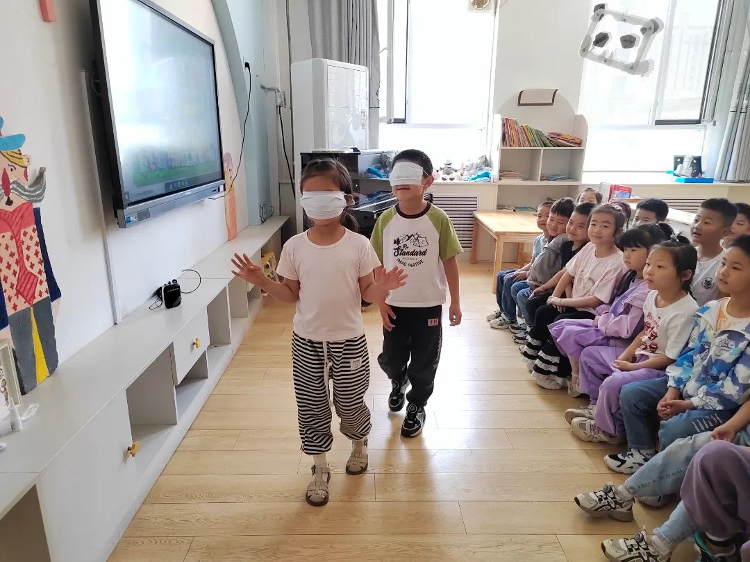 在互动环节,各班老师引领孩子们戴上眼罩玩玩具、拿东西、做游戏,让孩子们切身体验眼睛、肢体等身体不适的残疾人生活。