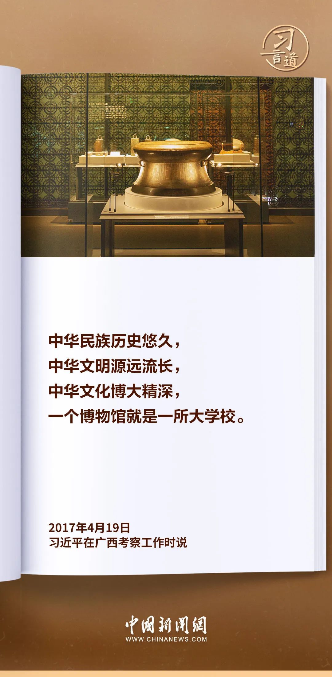 一个博物馆就是一所大学校。习近平总书记高度重视博物馆工作,多次发表重要论述,强调要积极推进文物保护利用和文化遗产保护传承。