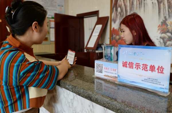 “得知可以自愿申报‘信易游’示范单位之后,我们积极主动申报,也签订了服务承诺书,‘信易游’对我们开展诚信经营是一种监督和鼓励。”北戴河北华园观海酒店前台经理杜晨辉说。