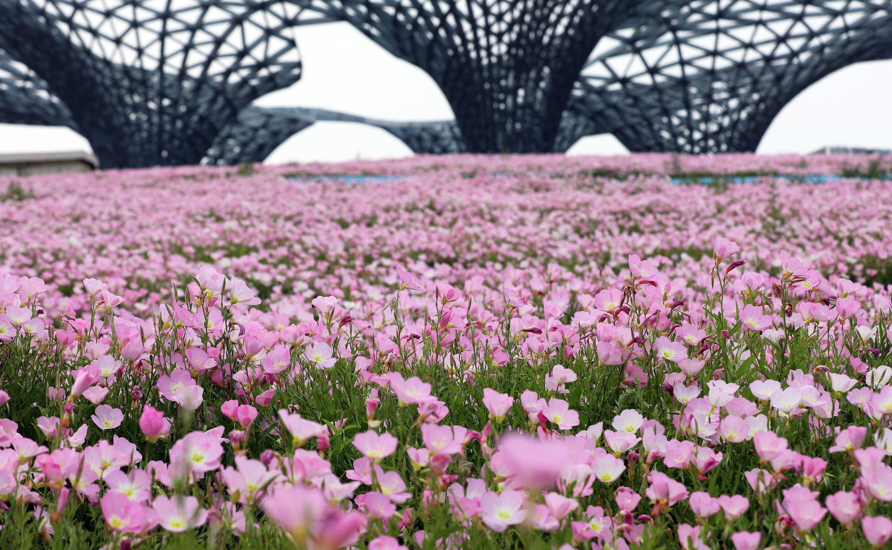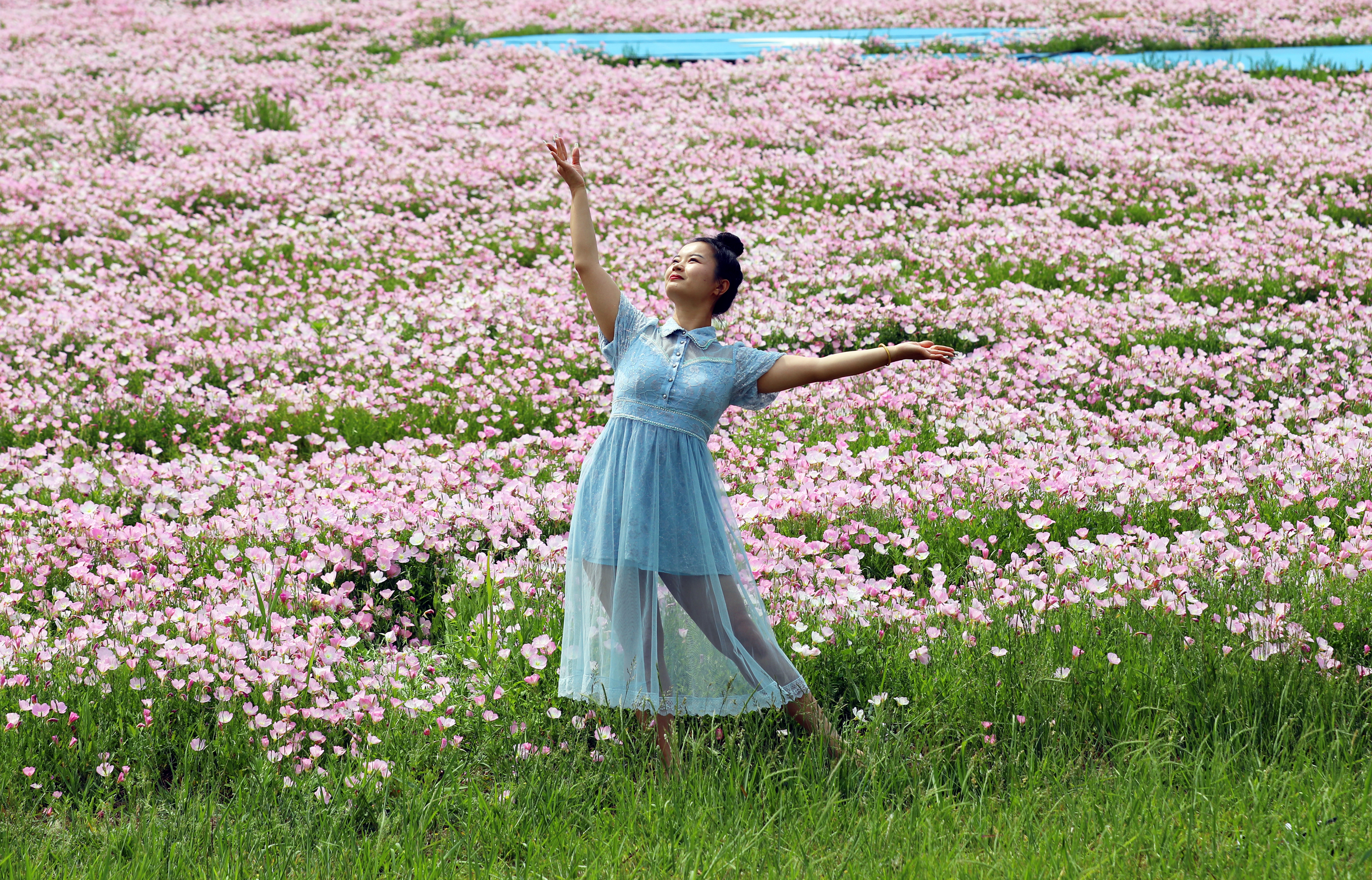 5月21日,在园博园内,游人如织,他们或牵手漫步花海,或乘坐观光车穿梭,或与花儿合影留念,园区内传来阵阵欢声笑语。沿着宽敞的主游路前行,映入眼帘的是一大片盛开的月见草,花朵密密匝匝,簇簇相拥,宛如云霞。举目望去,粉白色的花朵,在蓝天映衬下,格外清新美丽;天空中不时有候鸟在头顶飞旋,或尽展身姿,或放声歌唱。花海舞动,鸟儿鸣叫,游客穿梭其间,犹如徜徉在童话世界。