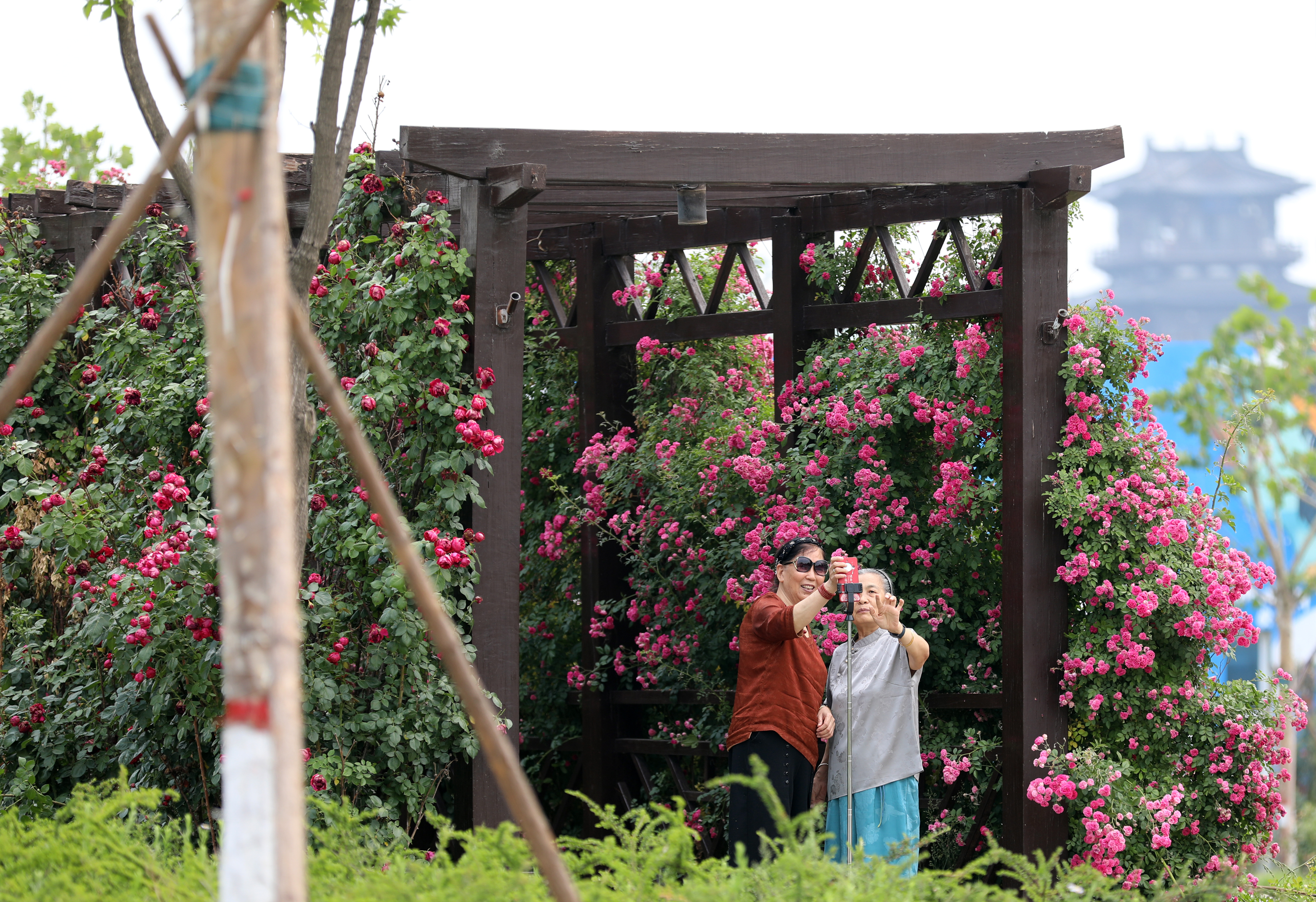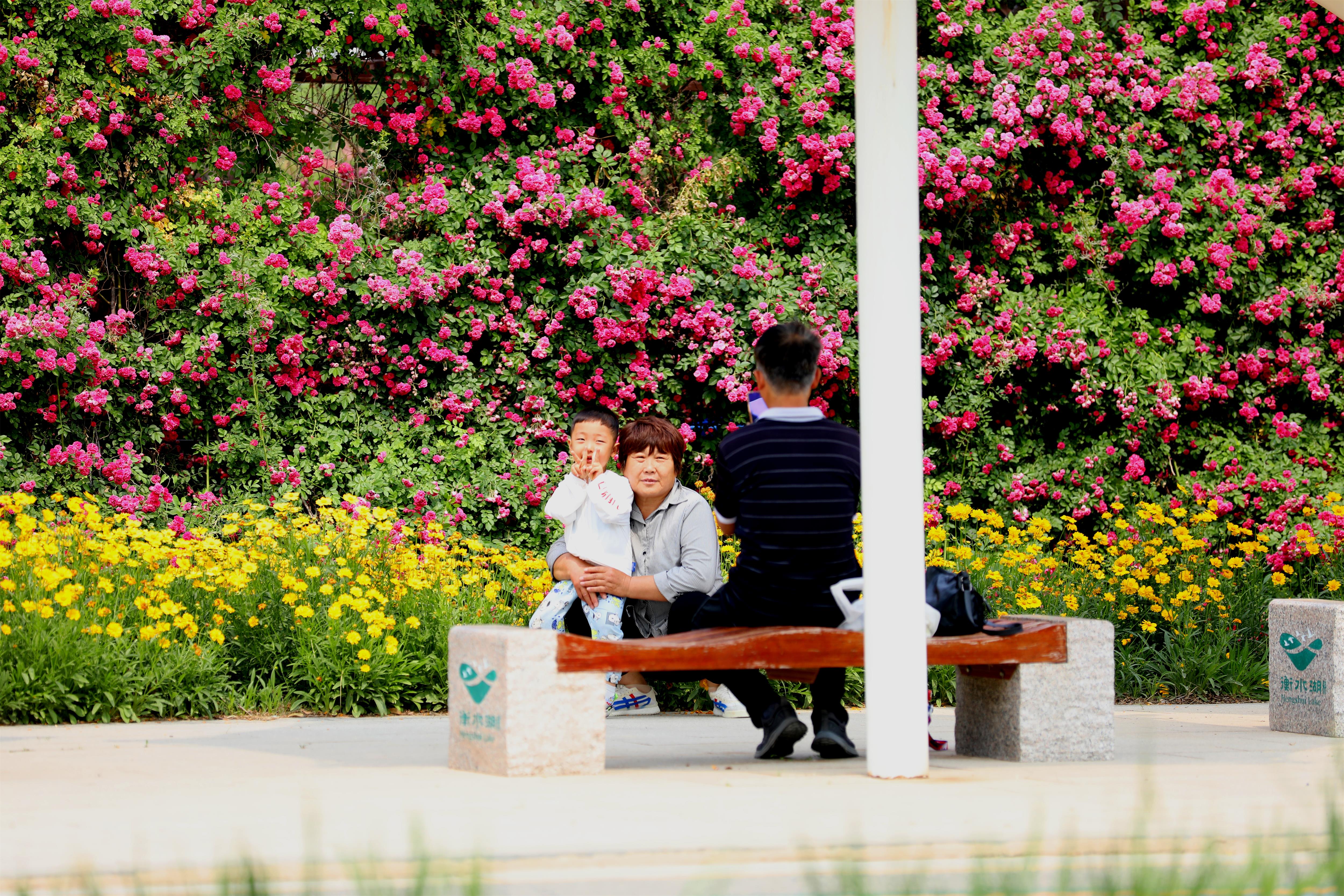一路前行,来到蔷薇花廊处,微风拂过,花海像波浪一般涌动,沁人心脾的花香,层层叠叠花海让人如痴如醉。来自石家庄的陈先生和爱人计划自驾游到海边,途径此地,他说,在这里看到非常多的鸟类,空气清新,四处飘香,环境好,一侧是波光粼粼的湖水,一侧是树木葱茏及各色的花海,这样的景色,让人流连忘返。