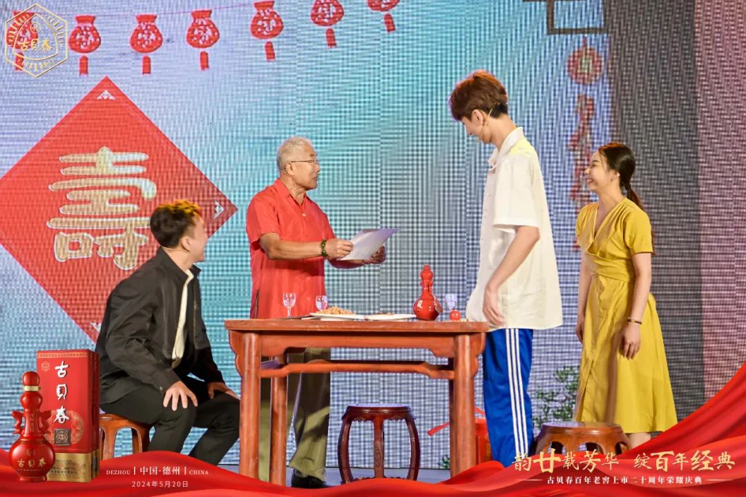 庆典现场,情景剧《岁月流金·喜酒飘香》以生动的表演形式展现了古贝春与人生喜事的紧密联系。古贝春作为中国传统名酒,见证了无数幸福时刻。在婚礼上,一瓶古贝春百年老窖见证着两个人的爱情故事;在生日宴会上,古贝春百年老窖陪伴着家人朋友共同庆祝;在升学宴上、古贝春百年老窖见证着学子的成长;在工作成功之际,古贝春百年老窖见证着团队的辛勤付出。岁月流金·喜酒飘香,让我们与古贝春百年老窖共醉时光!