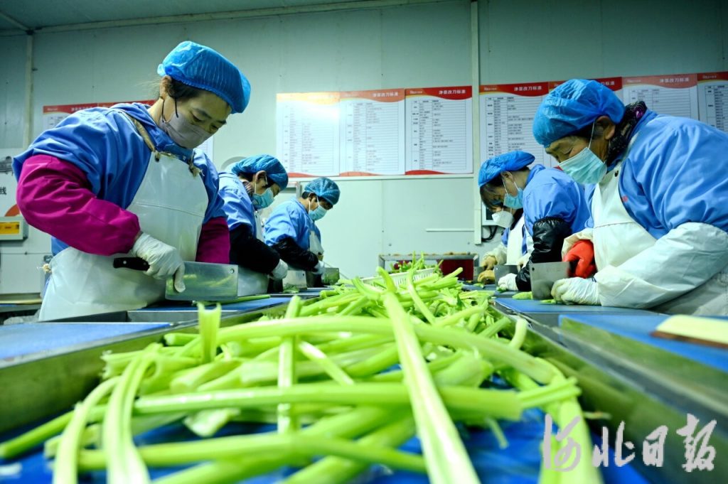 2月7日,在深州市河北农速源冷链物流有限公司的净菜加工车间里,工人正在按照客户需求切分西芹。河北日报记者焦磊摄