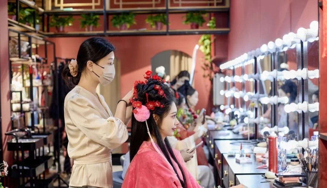汉服体验馆的妆造师(左)正在为顾客打扮。河北日报记者 张晓超 摄