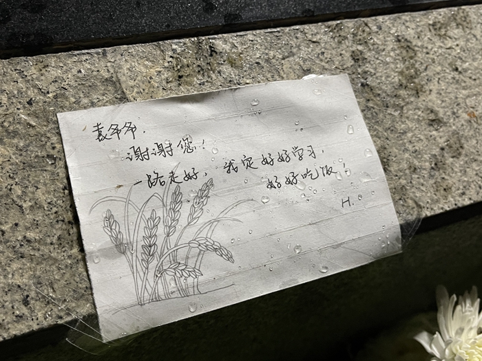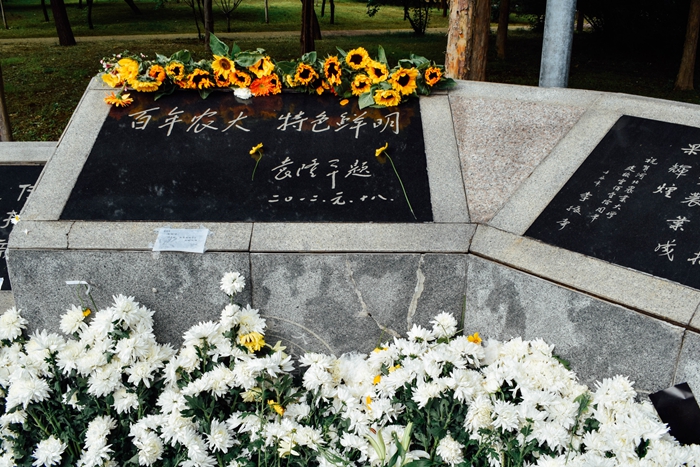 2021年5月22日晚,河北农业大学师生自发到刻有袁隆平题词的碑刻处敬献鲜花。图源河北农业大学官网