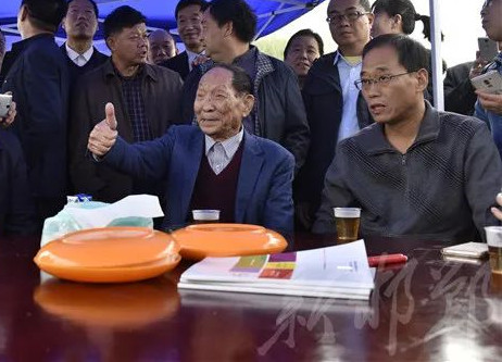 2016年9月26日,袁隆平考察永年超级杂交稻“百千万”高产攻关示范田。图源邯郸日报