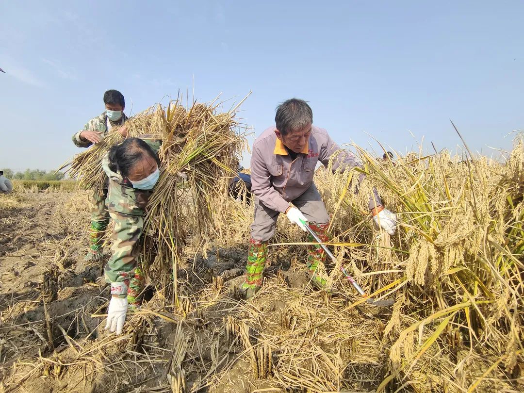 2021年10月23日,在邯郸永年河北省硅谷农业科学研究院“杂交水稻”创高产示范基地,村民们正在收割杂交水稻。科技日报记者马爱平/摄