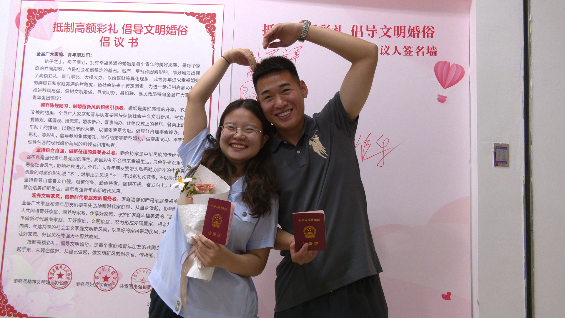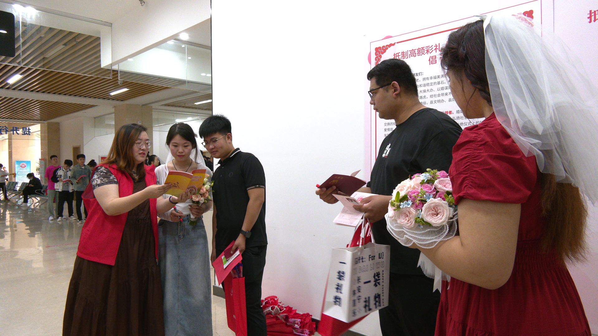 群众郑弘洋说:“今天我们领证结婚,比较有寓意,我们也会响应国家号召,树立正确婚恋观,不盲目攀比、大操大办,不去过多关注彩礼,而是把大部分的精力和金钱投入到营造幸福的生活中。”