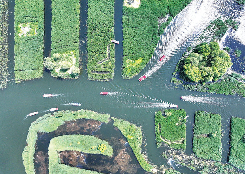 五月八日,游船在雄安新区白洋淀内行驶,游客在船上欣赏白洋淀的初夏风光(无人机照片)。新华每日电讯记者牟宇摄