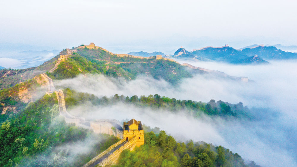 初夏细雨过后,朦胧雾气升腾,金山岭长城在崇山峻岭间曲折蜿蜒、若隐若现,像一条巨龙横卧在群山之巅。
