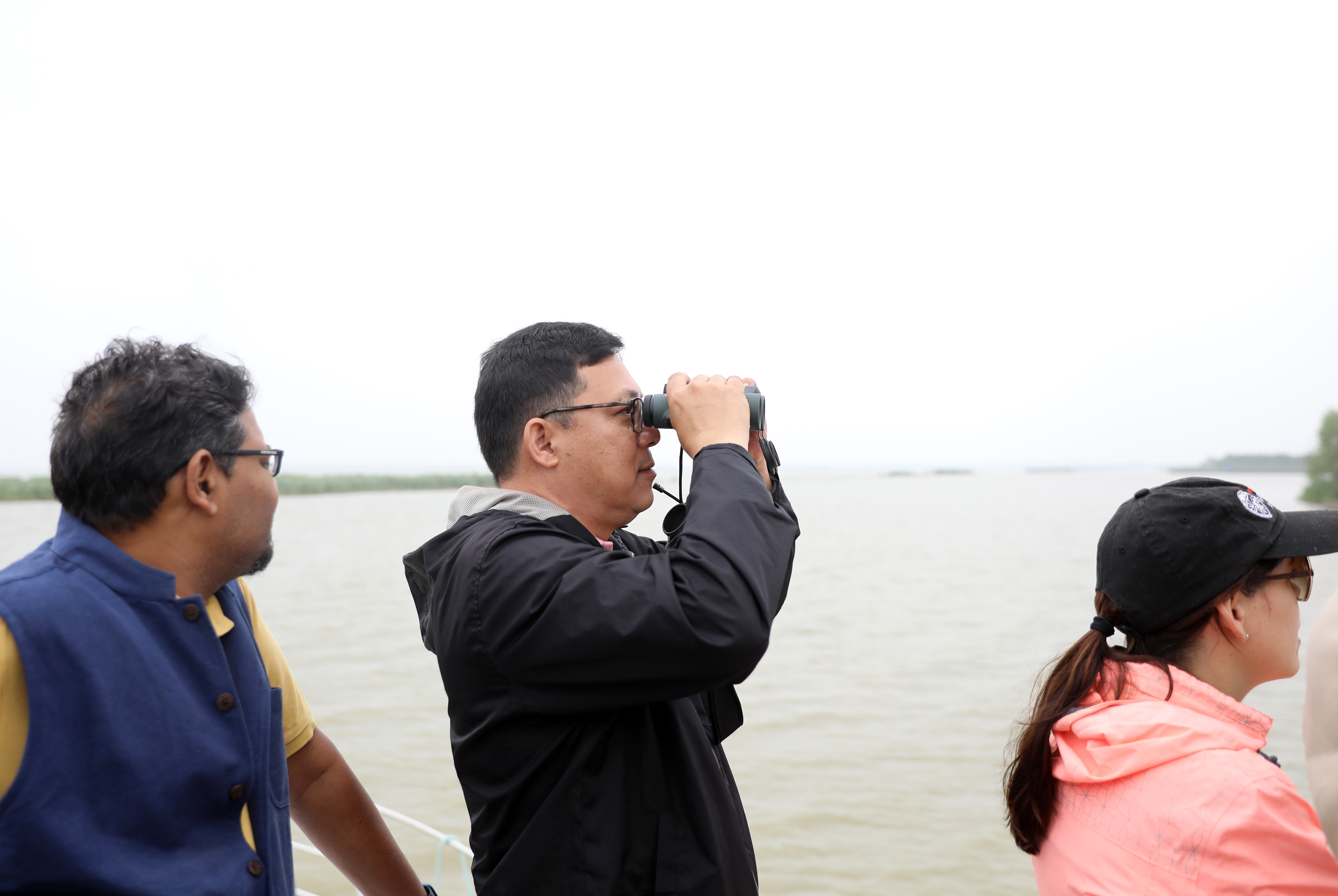 会前,参访团一行到衡水湖小湖隔堤、梅花岛、三生岛进行实地走访,探寻着这片生态区域的奥妙与神奇。晨曦初露,群鸟齐飞,风声、水声、鸟鸣声交织一起,合奏着自然生态的和谐旋律。参访团在小湖隔堤了解了衡水湖保护与发展方面所做的工作和采取的措施,对衡水湖湿地保护与恢复理念的践行与推广方面给予了高度评价。