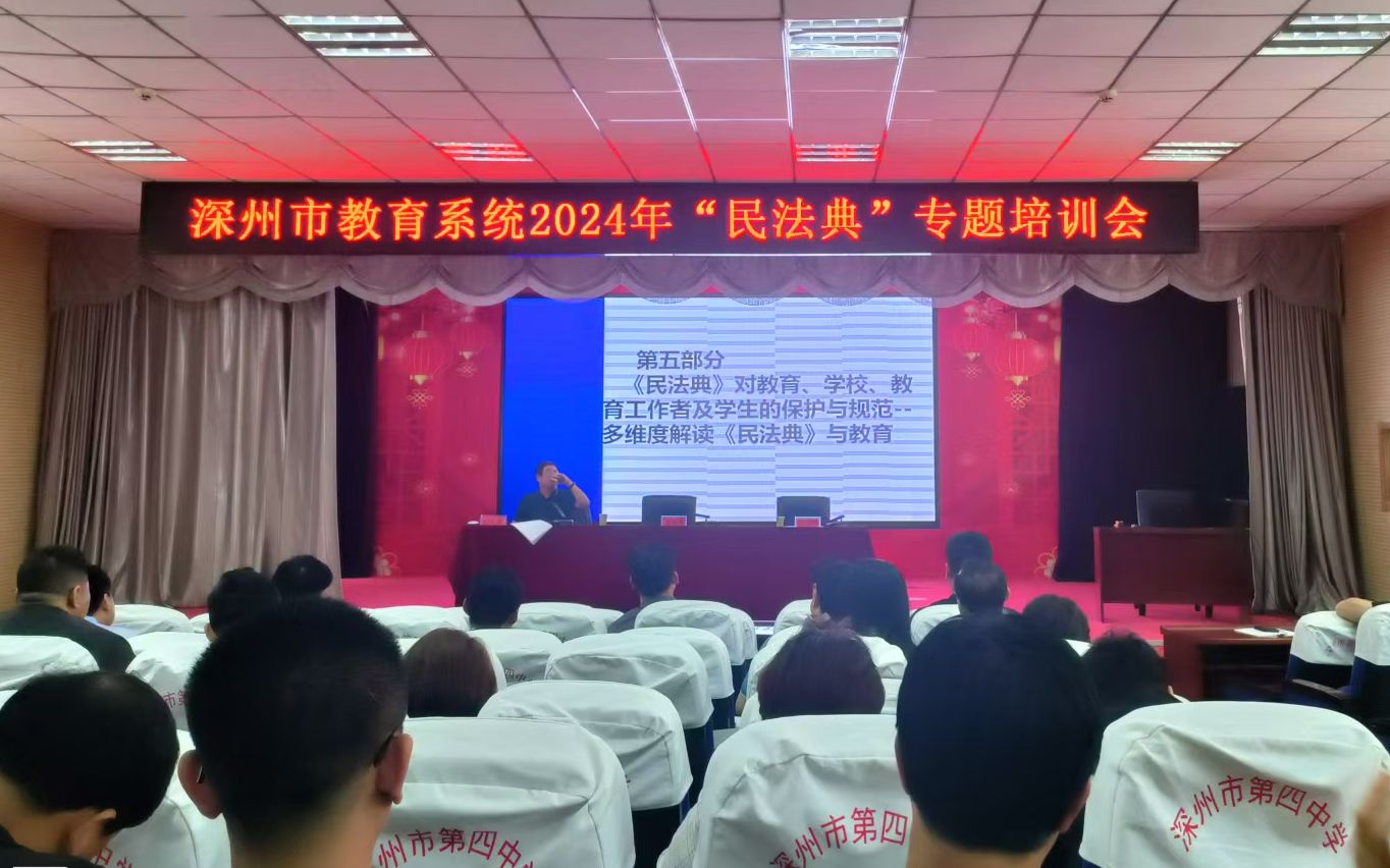 为深入贯彻落实习近平法治思想,推动民法典进校园活动,深化师生对民法典的理解与运用,深州市教育局于2024年5月24日下午3点在深州市第四中学成功举办了“坚持习近平法治思想 深化民法典宣传贯彻”培训班。此次培训班恰逢我国第四个“民法典宣传月”,旨在通过专业的法律培训和实际案例分析,增强教育系统师生的民法典意识。