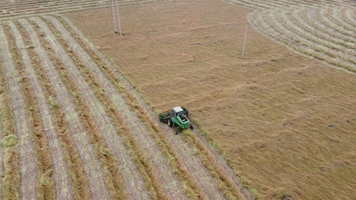近千亩油菜田里,收割机来回穿梭。王宁 摄