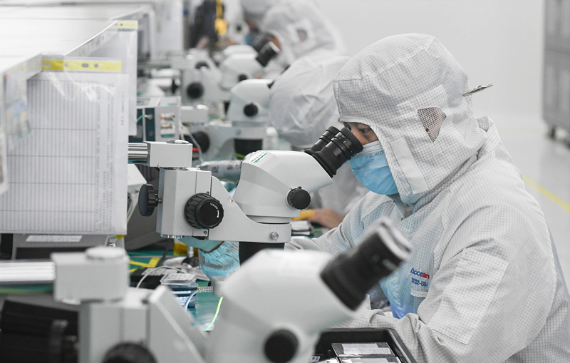 2023年4月11日,武汉光迅科技股份有限公司生产车间内,技术人员在光模块生产线作业。