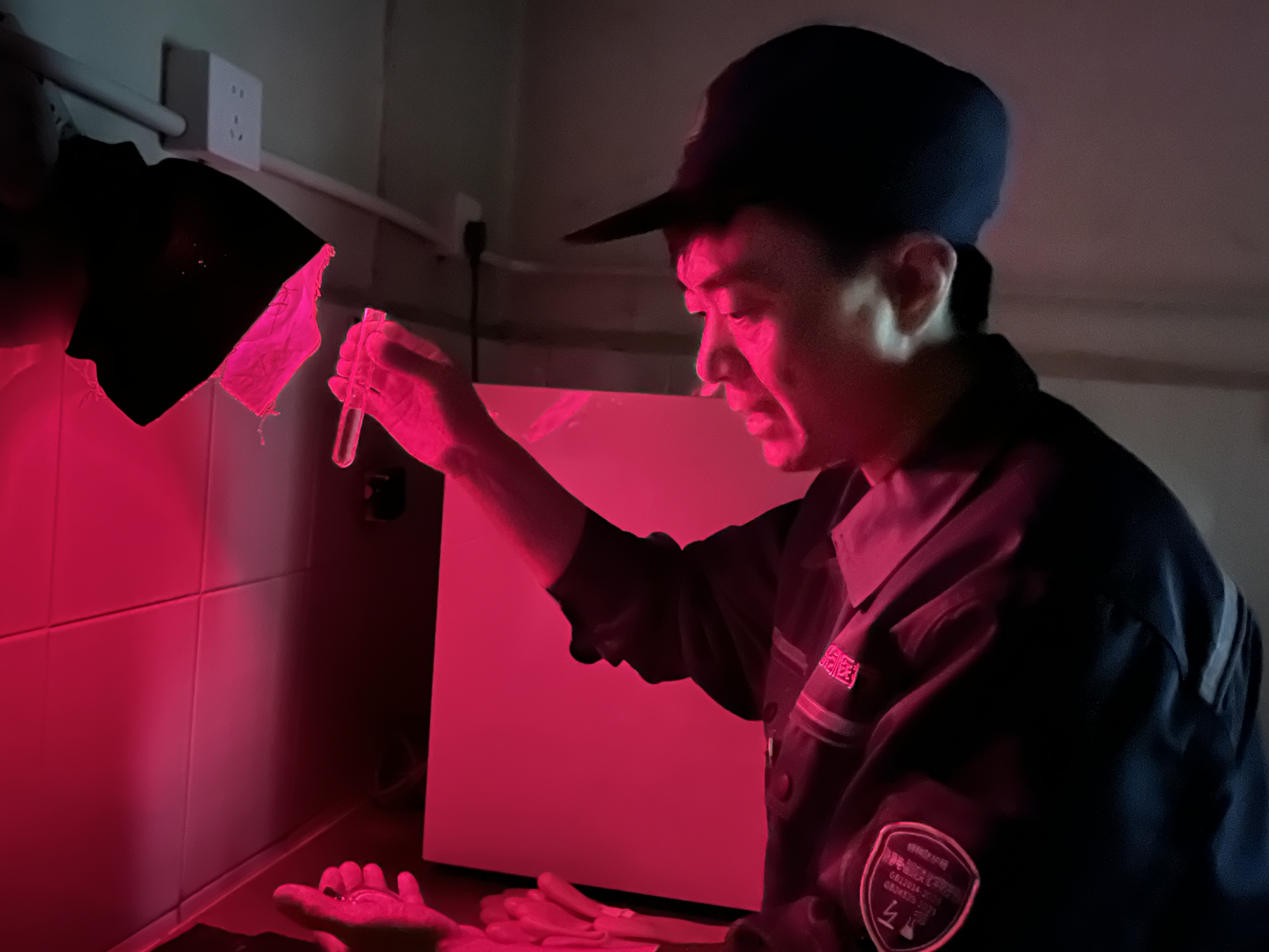 张宏伟告诉记者,暗室是他最常来的地方,经常一待就是一个多小时。这里伸手不见五指,刚来此工作时自己也是“处处碰壁”,但现在对实验室的布局、工具摆放位置早已了然于胸,即使和同事同时进行操作、使用工具也不会拿错,更不会发生碰撞的情况,“实验的时候,甚至不借助红光,完全无光我们也可以完成。”