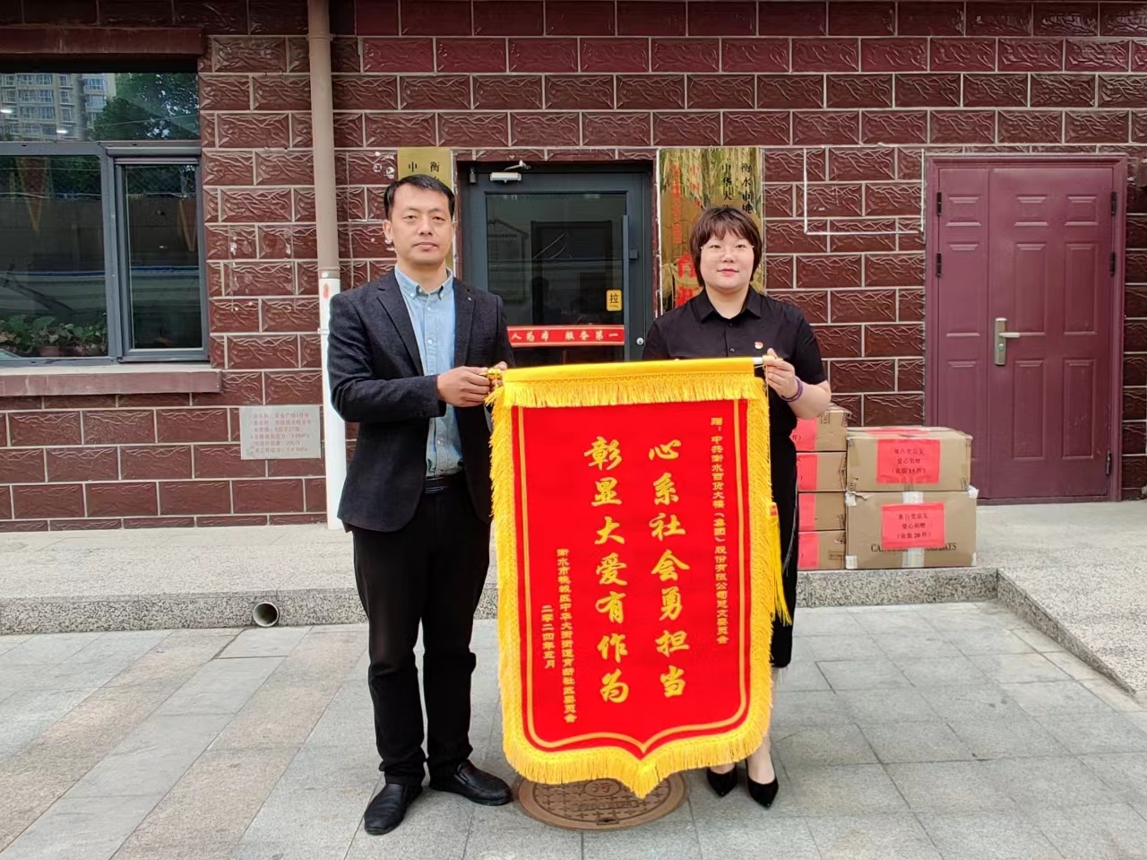 中华大街街道育新社区党委书记、居委会主任姜杰(左)为衡百集团党总支赠送锦旗。