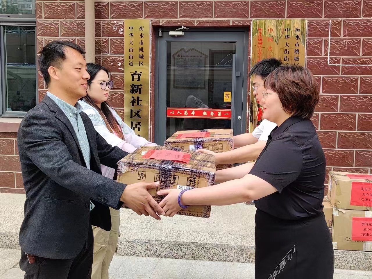 衡帮百忙——衡百集团党总支志愿服务队志愿者为中华大街街道育新社区居民捐赠衣服。