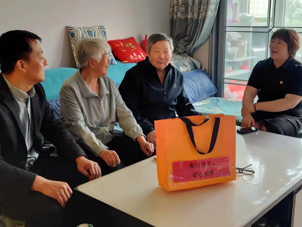 衡百集团党总支志愿服务队志愿者走进居民家中,听取老年人对志愿服务意见建议。